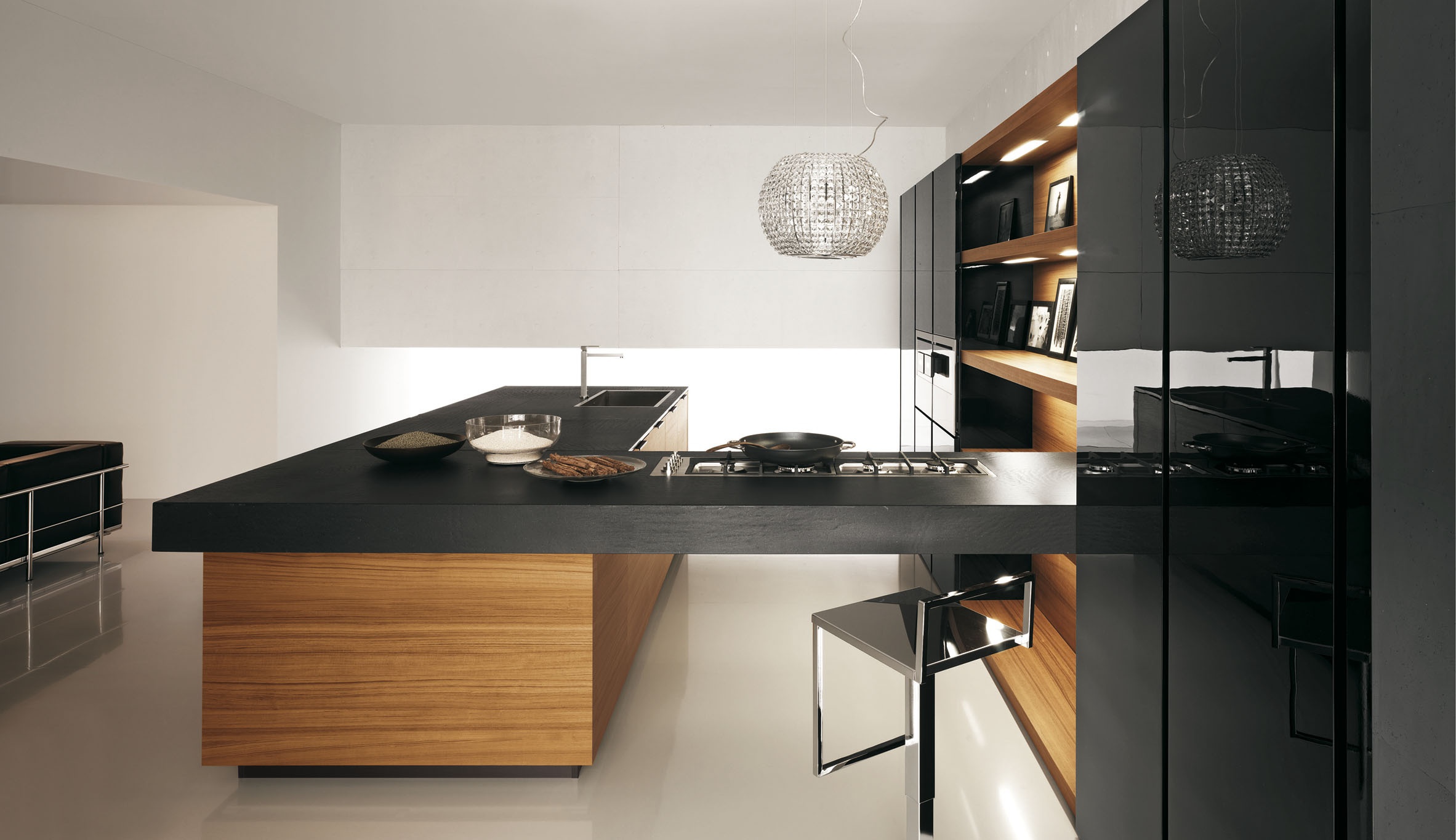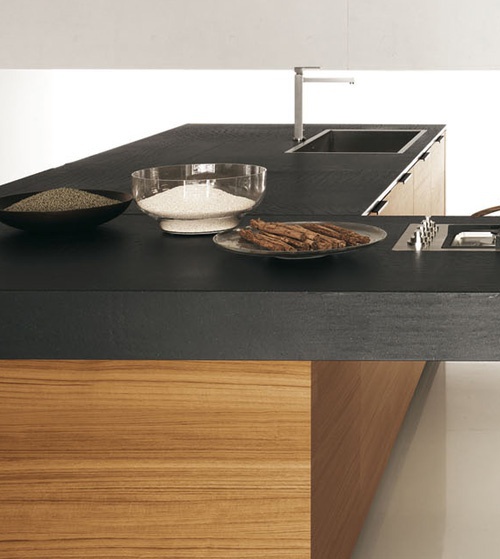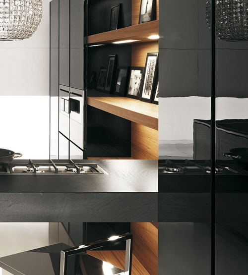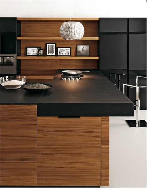 Modern kitchen Yara Cesar collection. Fold the base of the tick, the dark handle Filo. Fold high Cabinet –high-gloss black lacquer with the groove of dark aluminum. Shelves - teak. Table top made of agglomerate Stone Jaipur Pepper, thick. 2 cm and 14 cm High cupboards with side panels in black glossy lacquer. Base with “L”-shaped element teak. Hood-island Star.