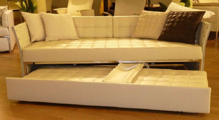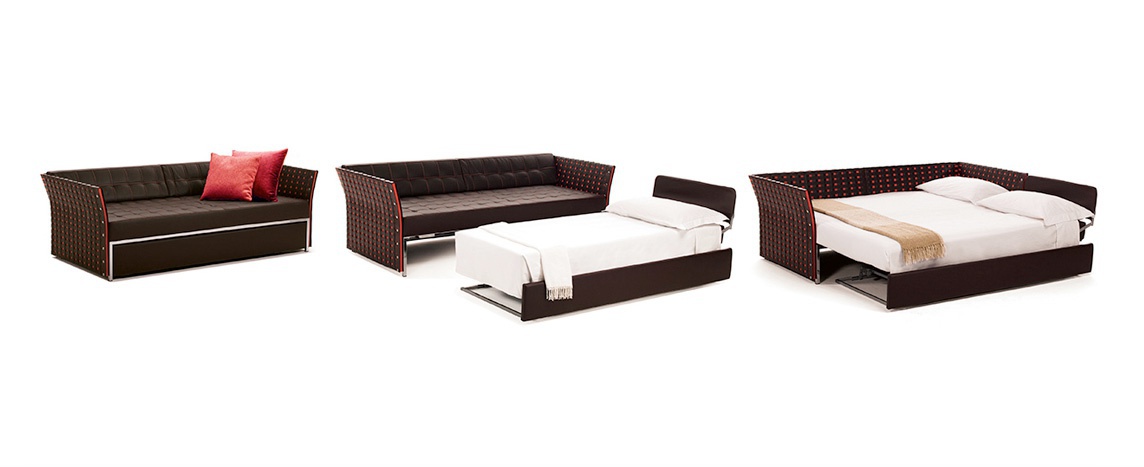 Three-seater sofa Canestro from the Italian manufacturer Zani. Model with roll-out single bed. The frame is made of solid fir and metal, the filler is polyurethane foam of different hardness and Dacron. Back cushion is goose down and polyurethane foam. Legs in polished chrome steel. Provided roll-out single bed, which can stand alone or up against the sofa, forming a great sleeper. Upholstery - leather with decorative stitching. As in the photo. Color in stock.