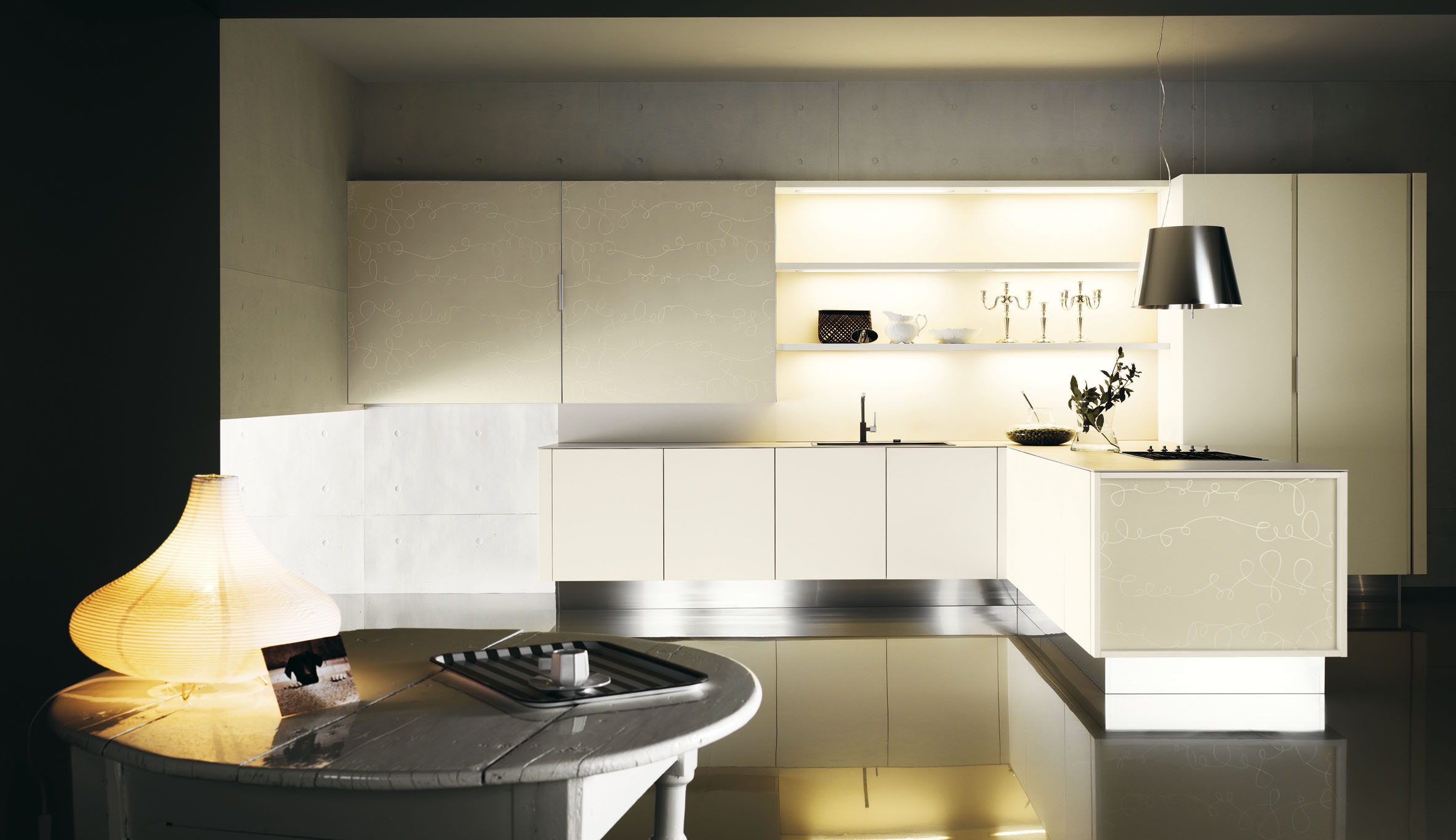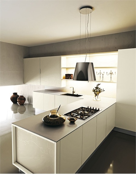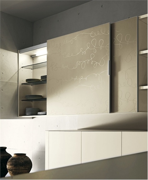 Modern kitchen Yara Cesar collection. Fold the hinged Cabinet made of tempered glass "ivory" with glossy serigraphy, sliding. The opening of the bases of push-pull. Worktop Laminam ceramic superslim color ivory, thick. 0.6 cm Base and high Cabinet with Quadro item of tempered glass "ivory" with glossy screen printing. Extractor fan Twin stainless. steel.