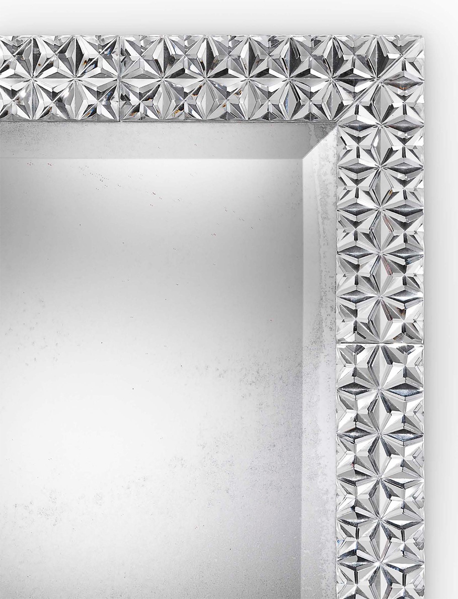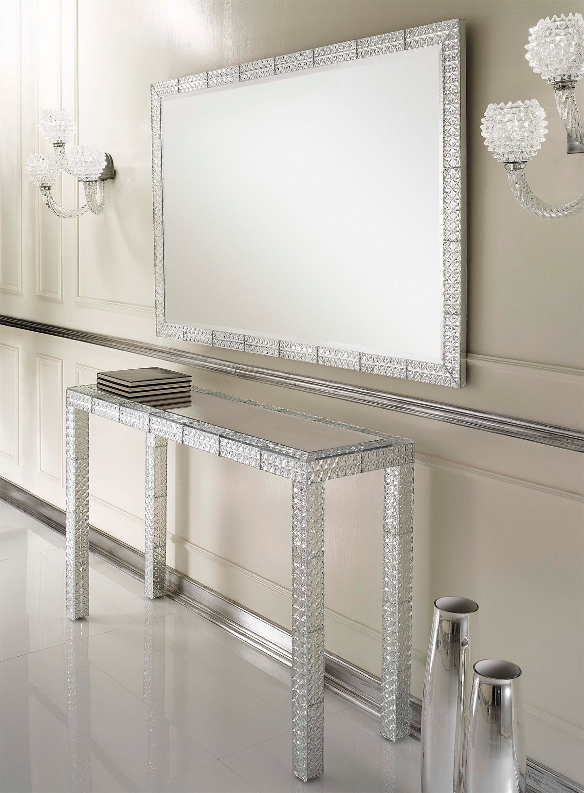 | Description: | The wall mirror from the Italian manufacturer Arte Veneziana. Wide rectangular mirror is designed in the art Deco style. Extrapolate mirror glass is mounted on a laminated wooden frame. Corners beveled mirror, silver plated carved pattern frame covered with silver leaf. Old glass is processed manually. Colors - transparent, silver; trim parts on the photo. |