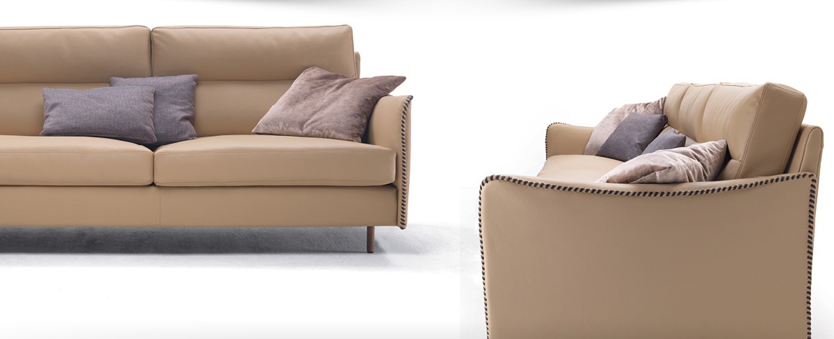 Three-seater sofa Romeo from the Italian manufacturer Zani. Model with a frame made of plywood poplar. The filler is polyurethane foam of different densities and Dacron. Legs made from metal. The upholstery is leather cream colour. Decorative seam made of leather to match the sofa. The model was introduced in Milan 2014.