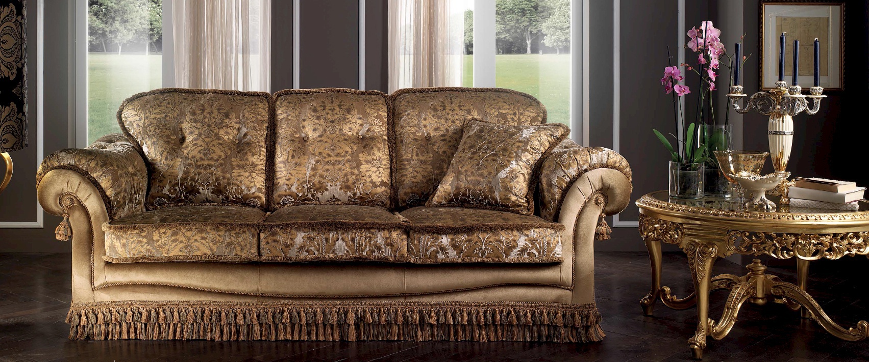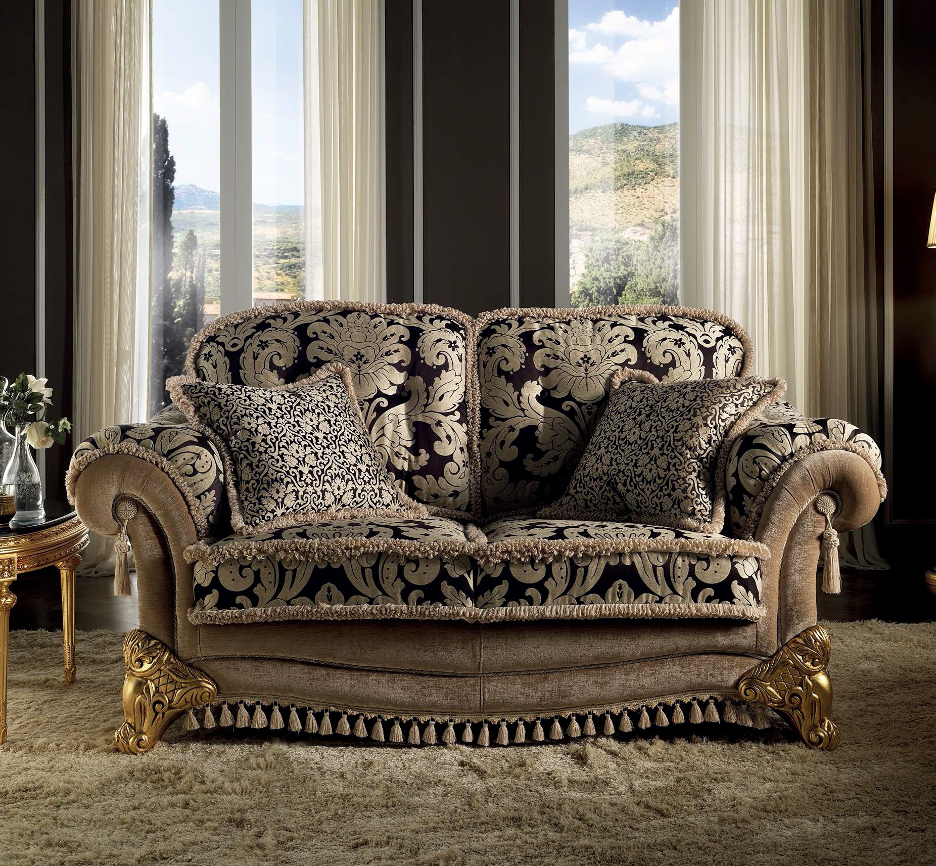 The Otello double sofa from Italian manufacturer Misura i Salotti. Skillfully decorated with a sofa in Baroque style will create an atmosphere of aristocratic luxury in any living room. The wooden frame is completely hidden by upholstery, on top of which look boldly sculptural carved gilt legs. Shaped back cushions and seats trimmed in fringe; the bottom of the sofa and soft rolled arms adorned with fringe and tassels. Upholstered in a skillful combination of textiles two types: plain and floral patterns from the company portfolio; colors to choose from.