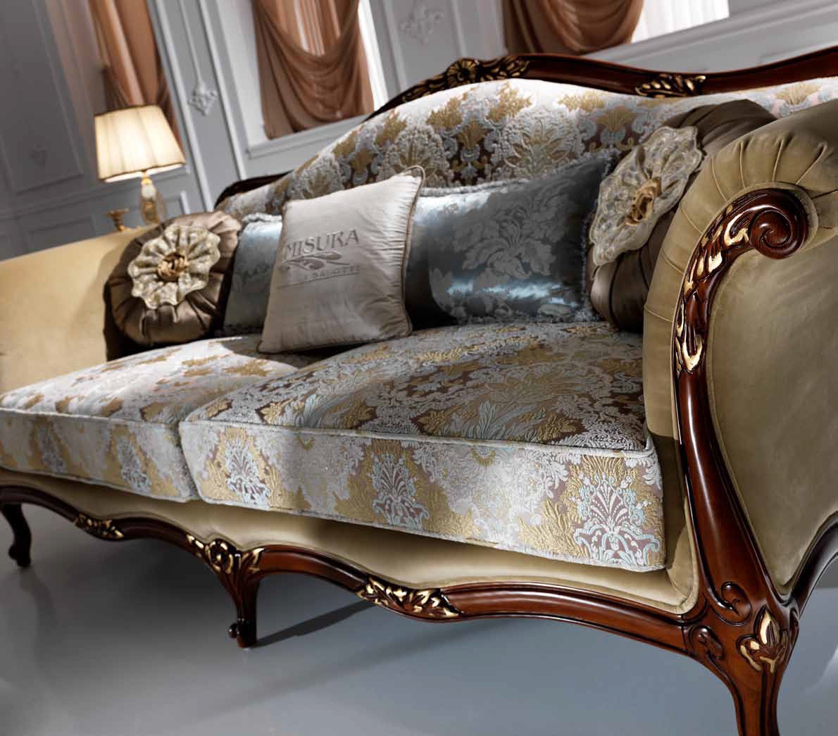 Raffaello double sofa from Italian manufacturer Misura i Salotti. An elegant sofa in the Rococo style will create a cozy atmosphere in any living room. The frame and carved legs-Cabriole made of wood and lacquered. The seat is formed by two cushions, upholstered in fabrics with floral pattern. Curly backrest and rolled armrests upholstered in plain fabrics. The choice of colors, textiles and finishes in the catalog of the manufacturer.