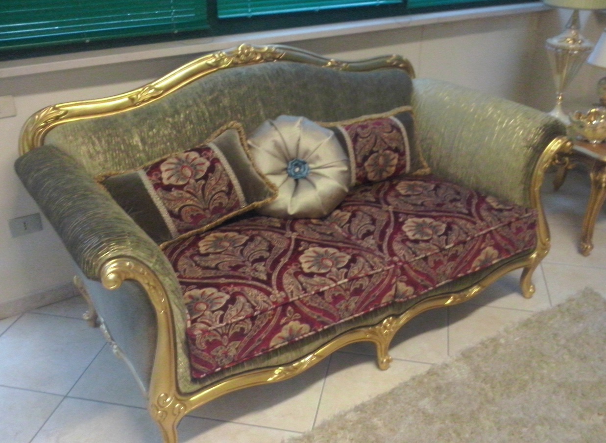| Description: | Raffaello double sofa from Italian manufacturer Misura i Salotti. An elegant sofa in the Rococo style will create a cozy atmosphere in any living room. The frame and carved legs-Cabriole made of wood and decorated with gilding. The seat is formed by two pillows upholstered with textile color Burgundy with floral pattern. Curly backrest and rolled armrests upholstered in gray beige textile. Details of finishes and colour range in photo 1. |