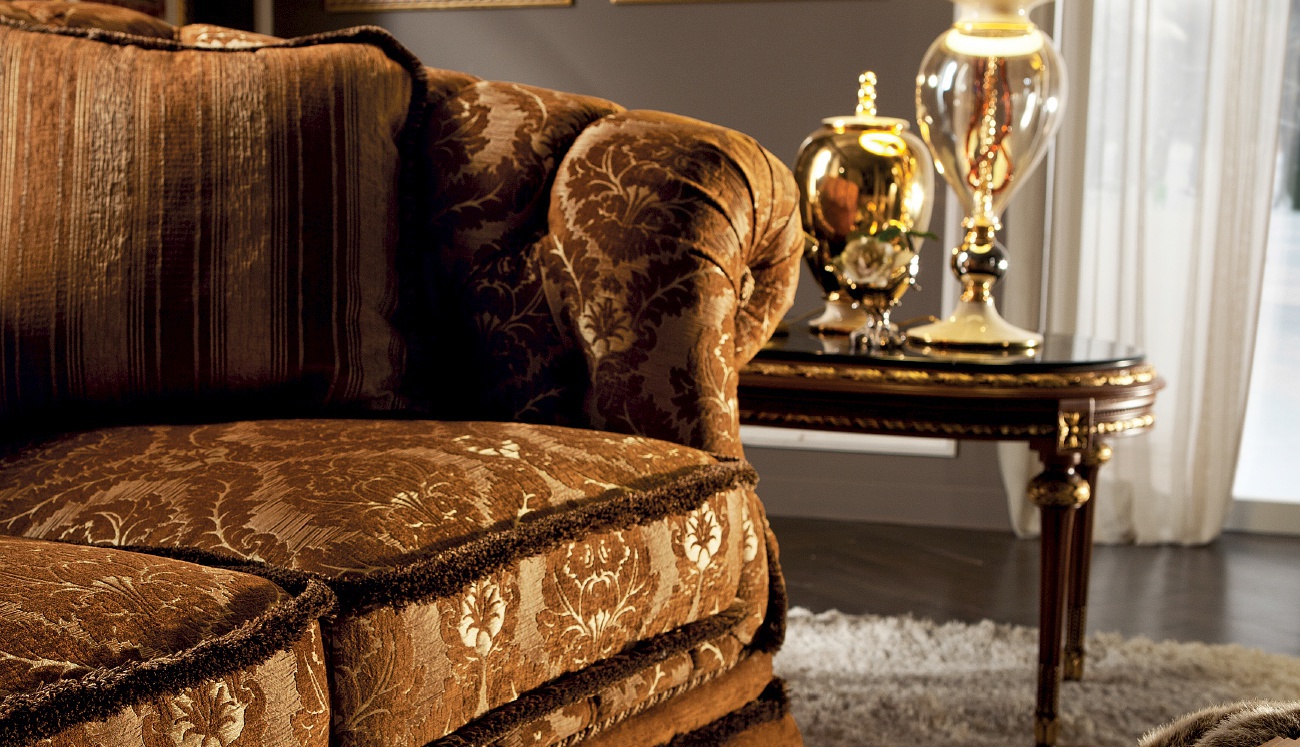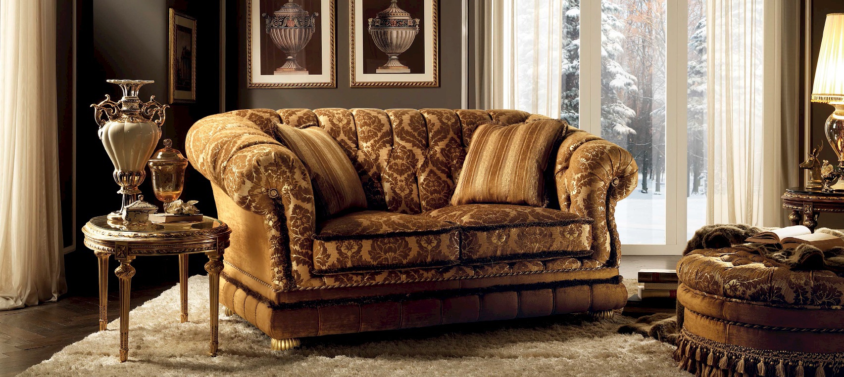 | Description: | Impero double sofa from Italian manufacturer Misura i Salotti. A cozy sofa in the Baroque style will be the focal point of any living room. The wooden frame is completely hidden by upholstery, carved round legs made of Golden metal. Curly backrest and rolled armrests quilted and finished with recessed buttons. The seat is formed by two large pillows with tassels. Upholstery - textiles in brown tones with a floral pattern; the bottom and sides are upholstered in plain beige textile. Trim the photo. |