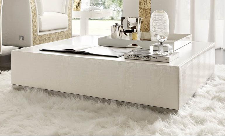 | Description: | Coffee table from the Italian manufacturer Florence Collections. An elegant model with a top made of white lacquered glass. Table on the sides leather upholstered - leather Moonlight White - Gabon cat.B. Design elements - a bright silver foil. |