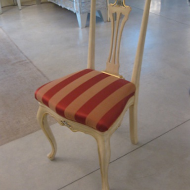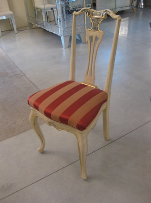 Chair Sedia Veneziana from the Italian manufacturer Arte Veneziana. Dining chair with upholstered seat and carved back designed in Venetian style. Frame, legs and backrest are made of wood and lacquered ivory. Upholstered seat covered with striped fabrics. Finish - carving and gilding. Details of finishes and colors in the photo.