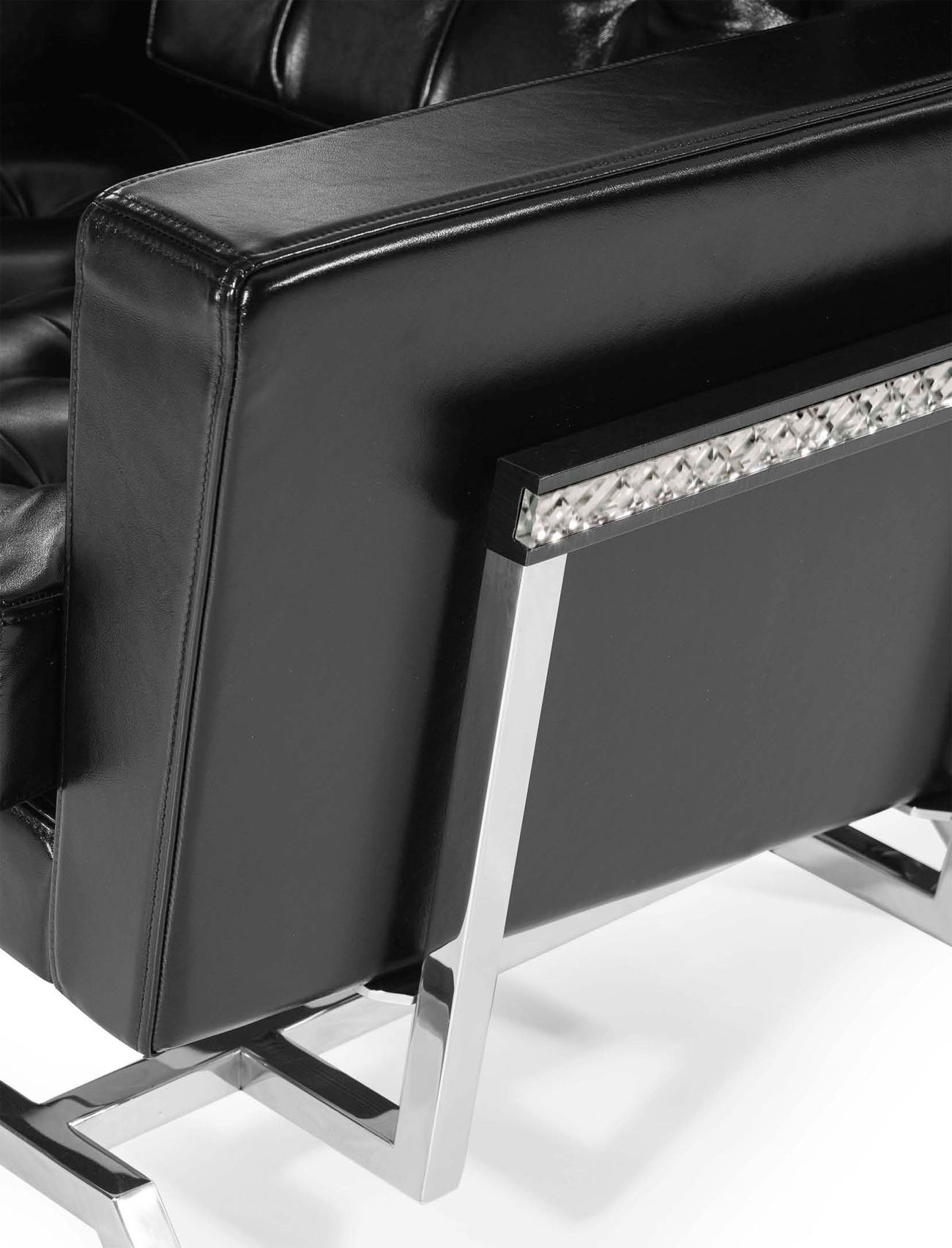 A chair from the Italian manufacturer Arte Veneziana. A comfortable armchair made by designer in high-tech style, high quality finish and versatility - it can be used in almost any room, from library to kitchen. The frame and legs of polished stainless steel. Upholstery - black leather "Bentley", backrest is trimmed with stitch Capito. The chair is refined with inlays of extraprostatic glass, hand polished. The choice of upholstery and trim in stock.