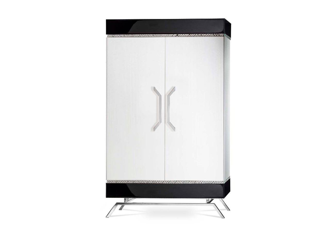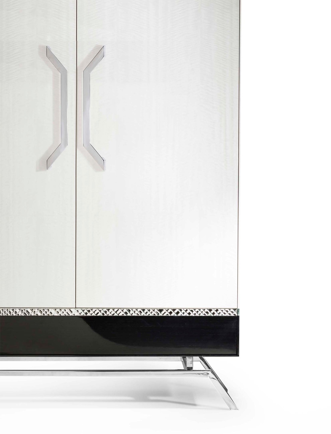 Wardrobe from the Italian manufacturer Arte Veneziana. The wardrobe, designed in modern style, looks great in a modern bedroom interior. The base, stem and handle polished stainless steel hand finishing. The frame is made of wood of two kinds: bleached and layered black; shiny lacquered frieze of Tanganyika. Two swing doors and side panels are finished in mirror polished accents, inner part soft lacquered ivory. Colors - black, white, transparent, silver. Finishes in stock.