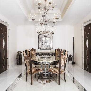 | Description: | Dining table from the Italian manufacturer Arte Veneziana. Oval table, made in the style of glamour that will adorn any dining room. The base is made of wood, decorated with antique, and decorated with silver and antique copper. Countertop: green onyx thickness of 20 mm, legs in Murano glass. The table is decorated with a mirror in which is viewed the lower and upper bounds. Colours - transparent, green, silver. Trim the photo. |