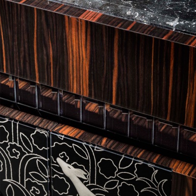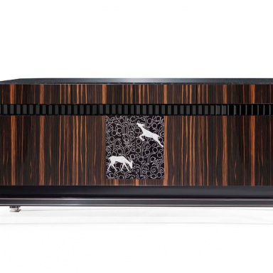 | Description: | Sideboard credenza from Italian manufacturer Arte Veneziana. Low sideboard, made in art Deco style, very comfortable in the living room or the dining room, which can be used as a buffet. The base is chrome-plated brass. Shiny lacquered frame of ebony trimmed with accents of black glass and decorated with silver engravings. Two swing doors, inside is a matte ebony. Colors - black, dark brown, silver. Trim the photo. |