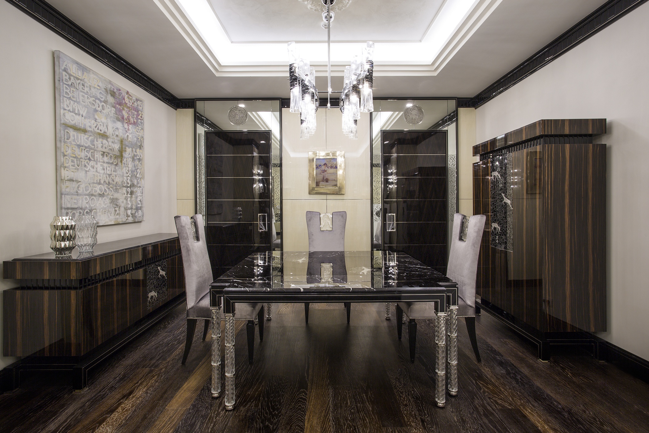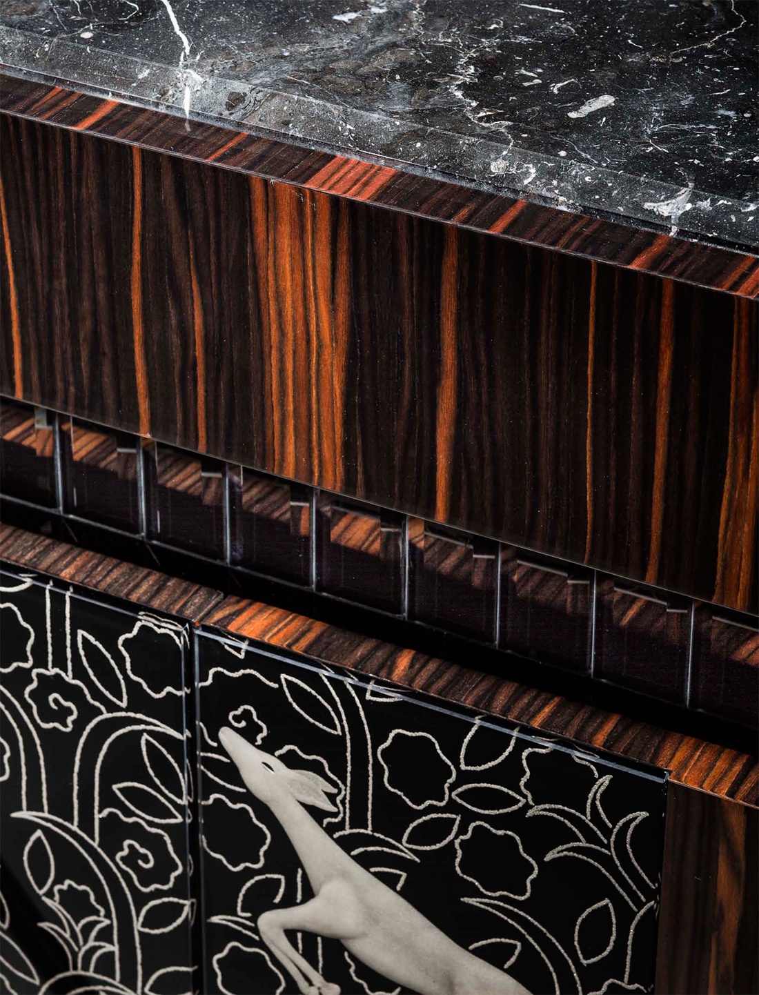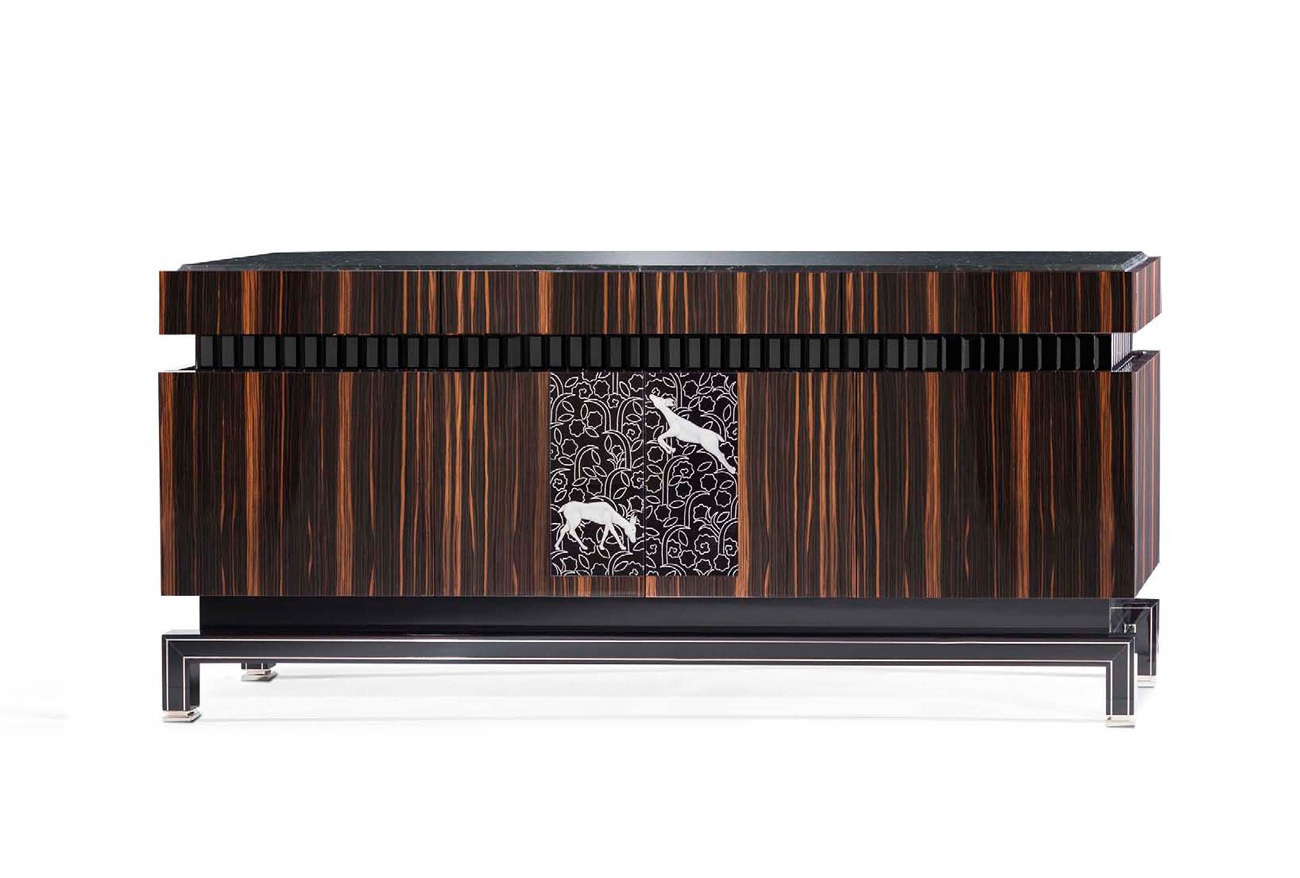 Sideboard credenza from Italian manufacturer Arte Veneziana. Low sideboard, made in art Deco style, very comfortable in the living room or dining room. The base is chrome-plated brass. Shiny lacquered frame of ebony trimmed with accents of black glass and decorated with silver engravings. Two swing doors, inside is a matte ebony. Colors - black, dark brown, silver. Finishes in stock.