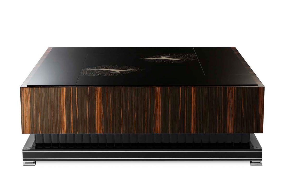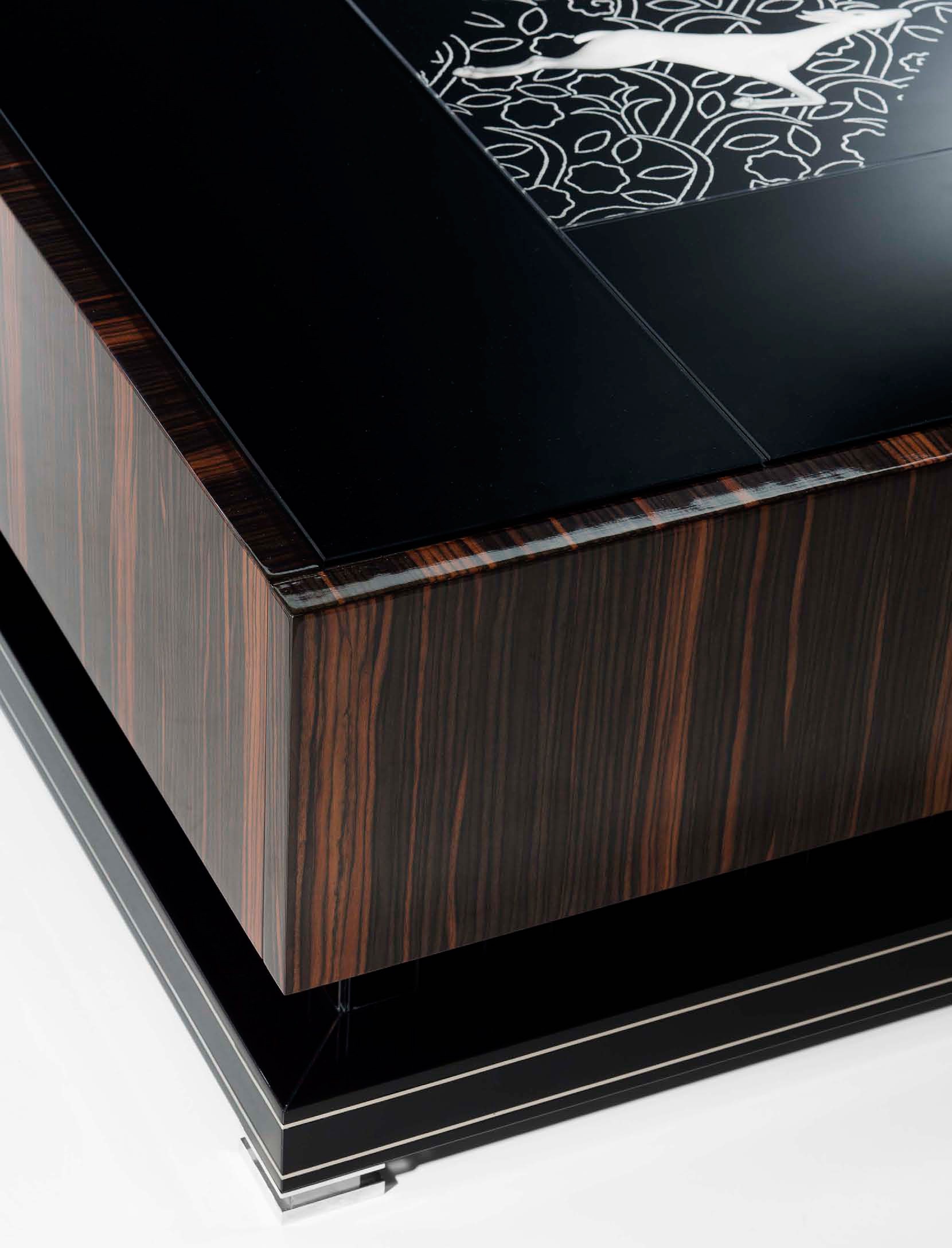 Coffee table from the Italian manufacturer Arte Veneziana. Low table, made in the style of art Deco, looks great in modern interiors. The base is chrome-plated brass. Shiny lacquered frame of ebony decorated with inlays from black glass. Top made of black glass and decorated with silver engravings. Colors - black, dark brown, silver. Finishes in stock.