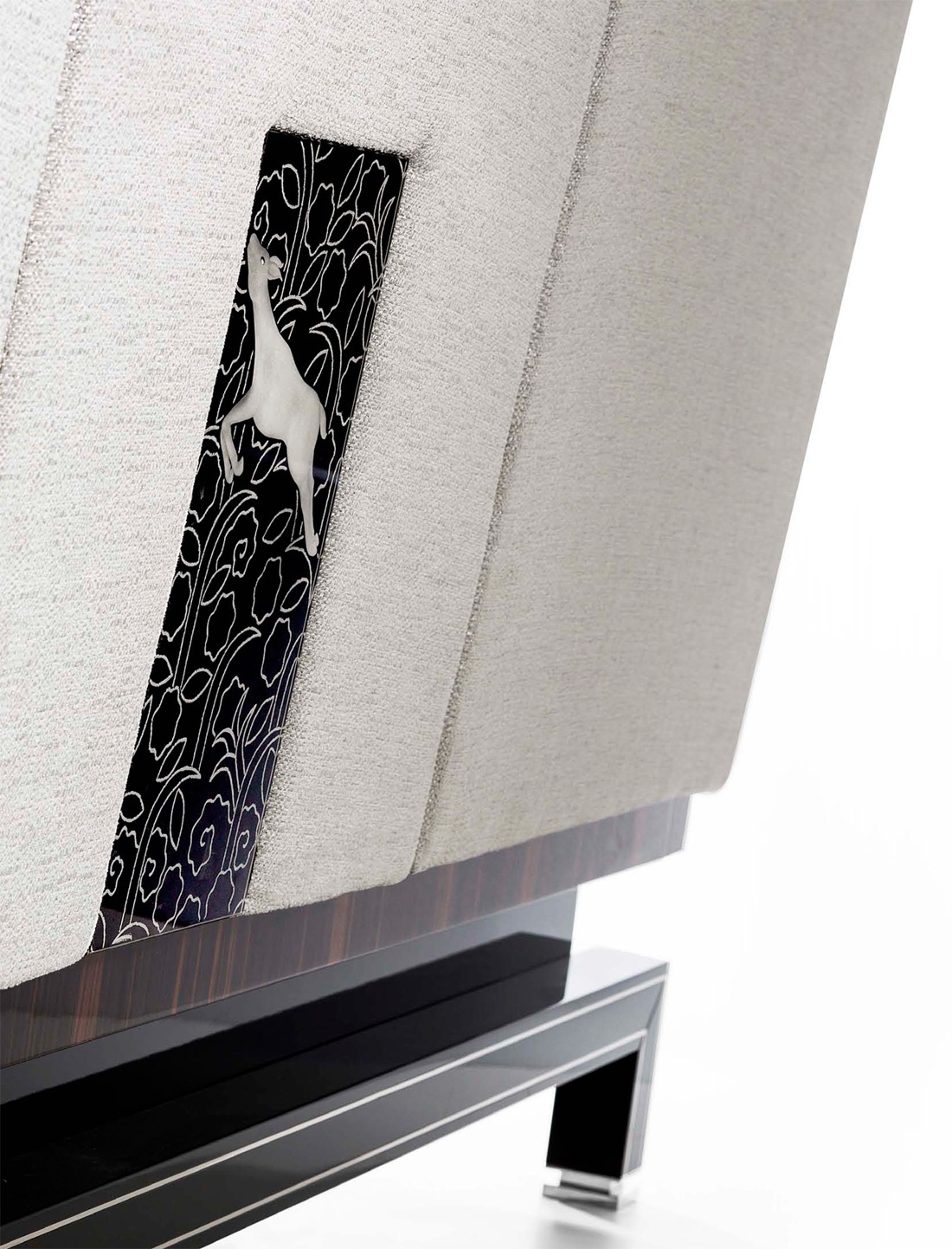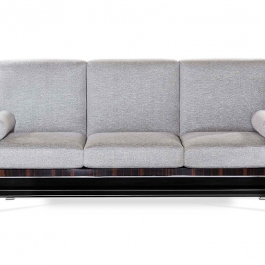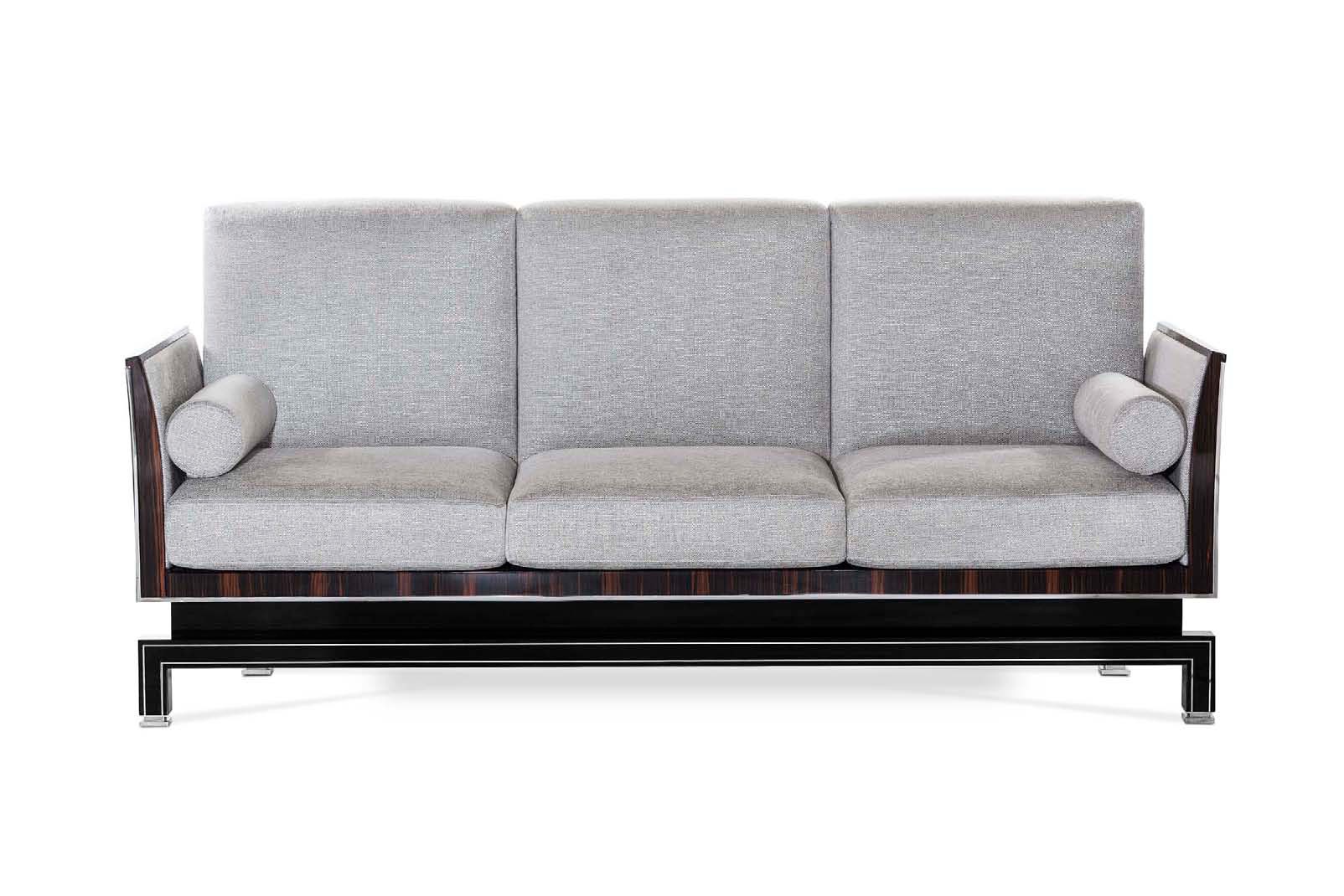 Three-seater sofa from the Italian manufacturer Arte Veneziana. Comfortable sofa, designed in art Deco style, perfectly fits in any modern interior. Frame made of black lacquered ebony wood with inlays of polished stainless steel. The base and legs of chrome-plated metal, light textile upholstery. Seat and back are formed by the three cushions on the sides - round rollers. The choice of upholstery and trim in stock.