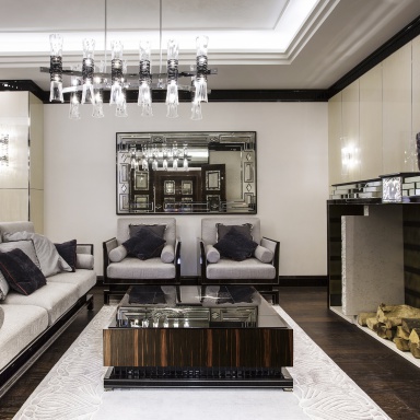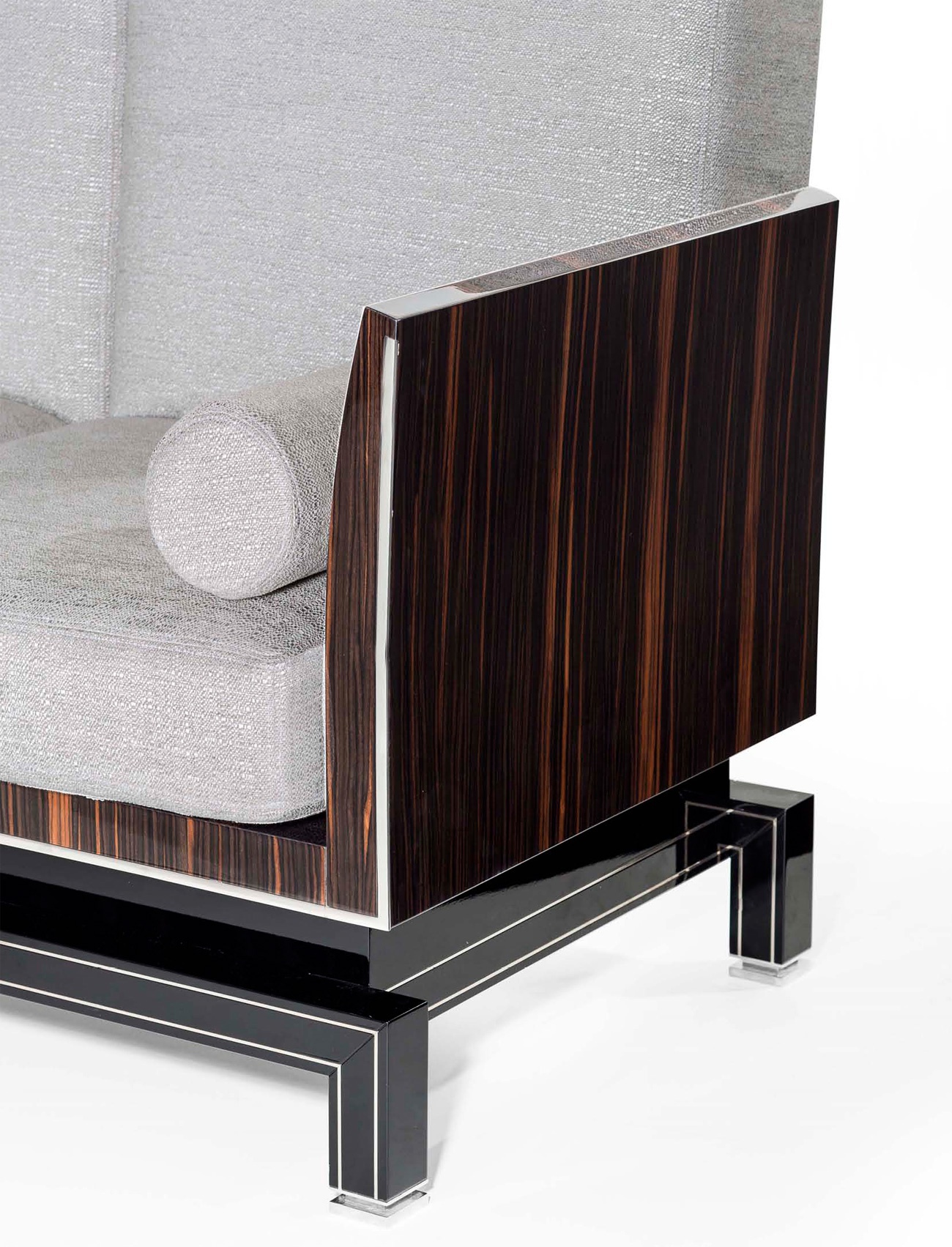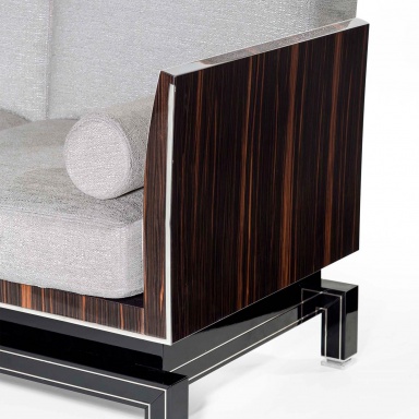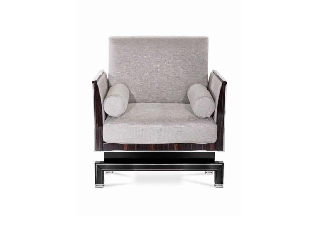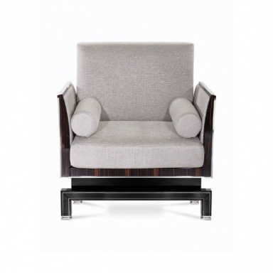 | Description: | A chair from the Italian manufacturer Arte Veneziana. Easy chair, designed in art Deco style, perfectly fits in any modern interior. Frame made of black lacquered ebony wood with inlays of polished stainless steel. The base and legs of chrome-plated metal, light textile upholstery, on the sides there are round cushions. Colors - light gray, black, dark brown, silver. Trim the photo. |