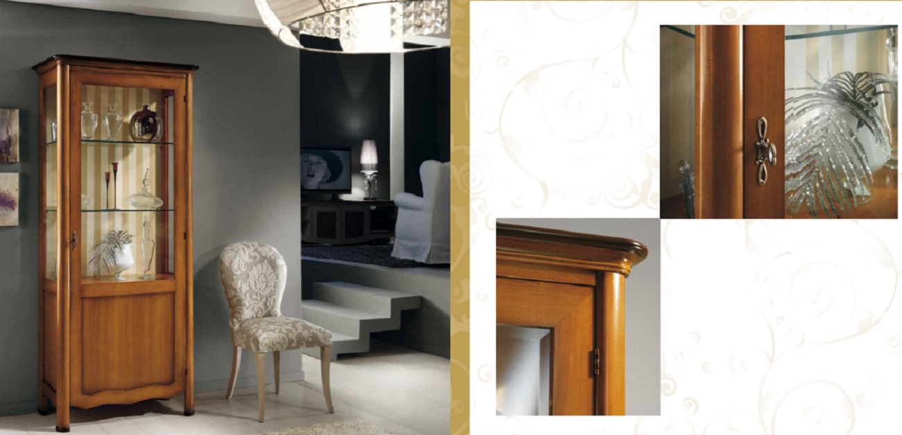 Showcase from Italian manufacturer CP Mobili. The model with one door. The frame is made from solid wood, sides and door glass. There is a shelf of tempered glass. Product in a classic style, perfectly fit into living room, dining room.