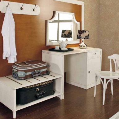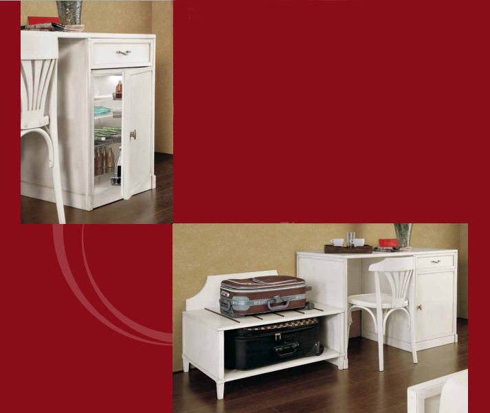 Set for hotel room from Italian manufacturer CP Mobili. Set includes the stand for suitcase, Desk, built-in refrigerator. Material - solid lime. The finish is white lacquer. The style - Provence.