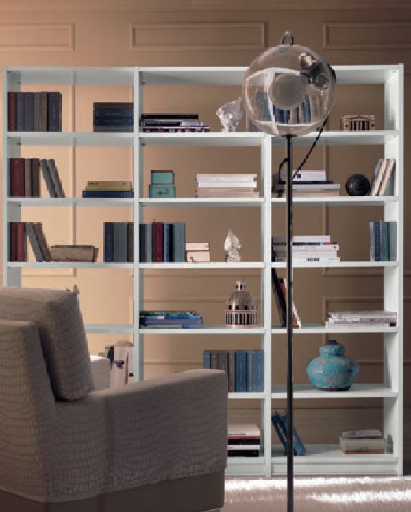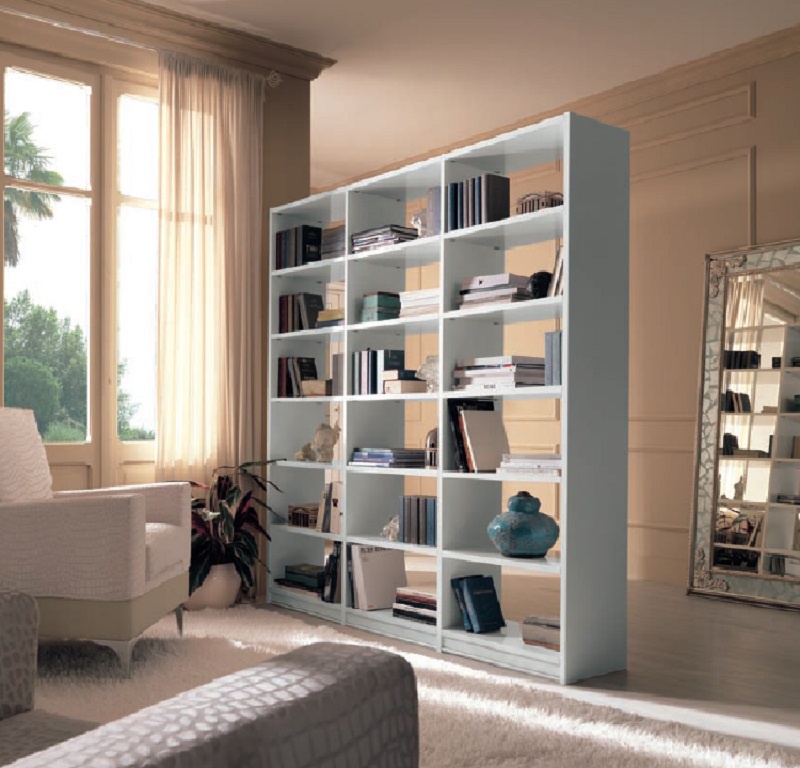 Bookcase bookshelf from Italian manufacturer CP Mobili. The model is two-sided, made of wood, there are 3 sections with open shelves. Finish - lacquer in white. The style is modern. Perfectly fit into office, living room, library.