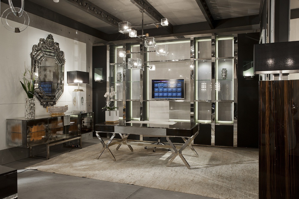 | Description: | Wall library Showroom from the Italian manufacturer Arte Veneziana. The big wall for books with a space for display is enough for all home equipment in a compact and convenient form. The middle part of the wall is designed for home theater - three large open shelves and a closed Cabinet for communications. On the sides of two bookcases with glazed double doors and two closed closet-case. The wall is made of black lacquered wood, brushed, and trimmed with stainless steel inserts and parts made of bleached wood from Tanganyika. Wrought iron finishes complement the mirrored inserts hand-engraved. Colors - black, transparent, mirror. Trim the photo. |