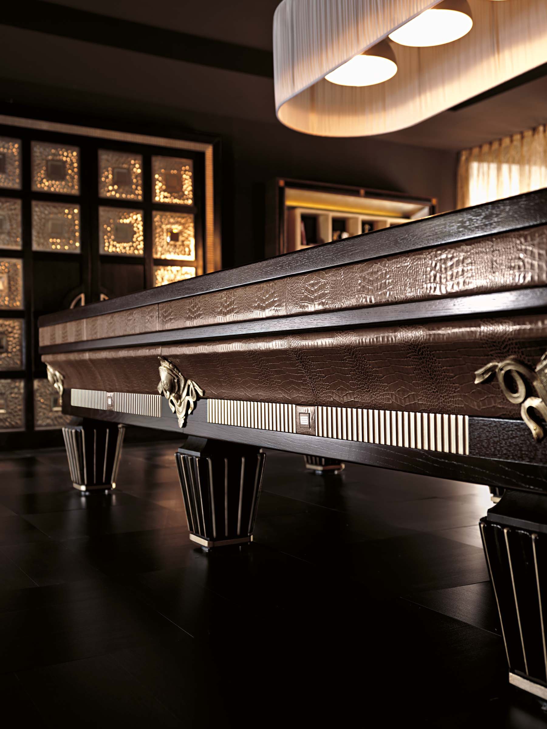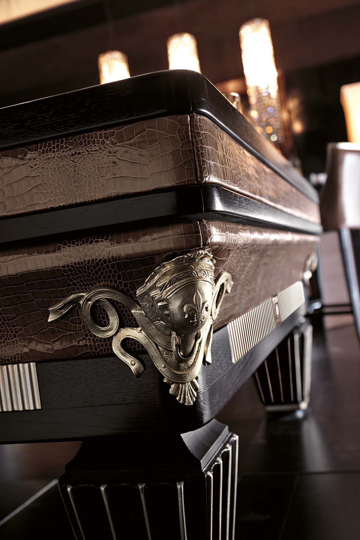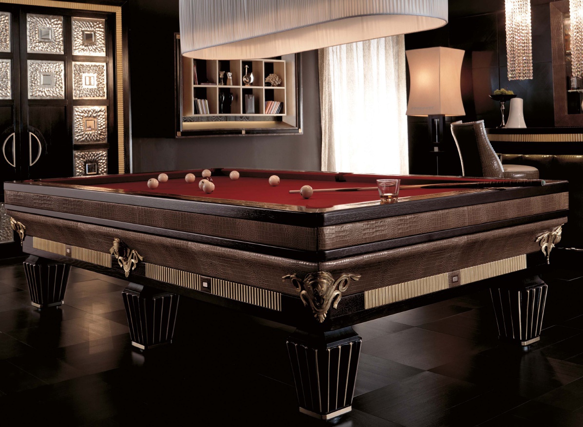 Elegant billiard table for Russian pyramid Italian producer from Florence Collections. The frame and legs with vertical carved wood, lateral parts covered with skin. Decorate the table with decorative elements and gold foil. The surface is covered with a cloth.