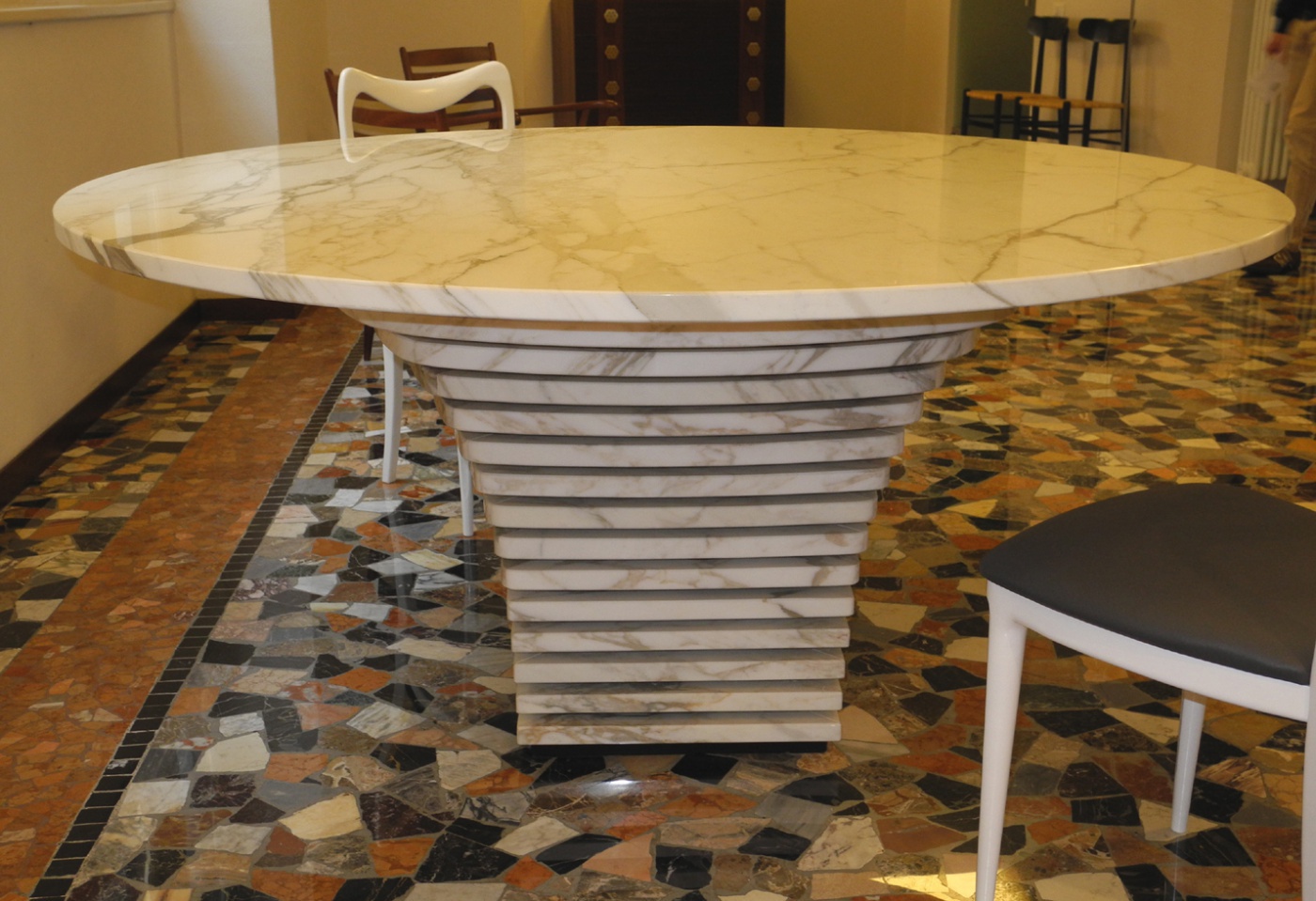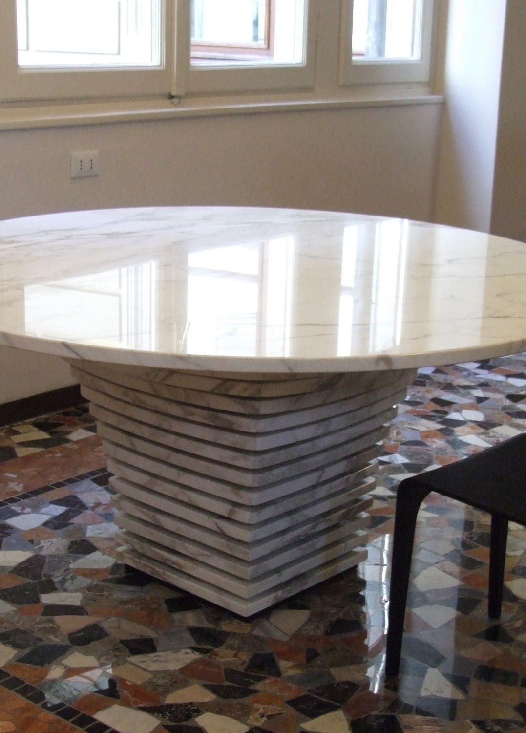 | Description: | Table Palermo from the Italian manufacturer Emmemobili. Original round dining table by designer Ferruccio laviani successfully complement modern interior dining room or living room. It is made of marble calacatta. The silhouette formed under the influence of the various elements stacked in the distance with wooden separators. Top 30mm thick. Colours - milky, light grey. Trim the photo 1,9,11,14. |