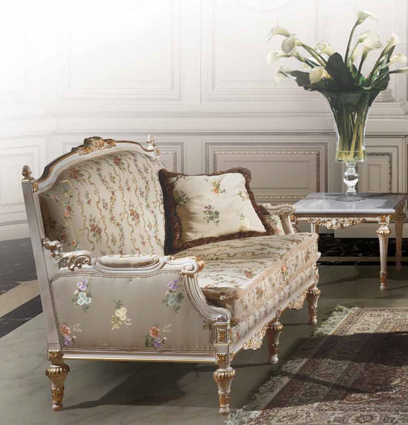 | Description: | Double sofa Louis XVI Style from the Italian manufacturer Ezio Bellotti. The material of the frame is natural wood, the upholstery is a silky fabric with a floral pattern of two species from a collection company. The frame and legs of the sofa are decorated with carved and gilded surround. The carved armrests with soft pads, and braces the back and bottom of sofa also decorated with carving, the Subject is in the collection of Louis XVI Style Rococo and will be a wonderful decoration for your living room or boudoir. Colors - milk, pearl and Golden tones. Trim the photo. |