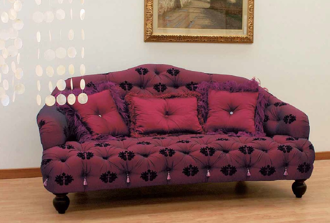 Rubino three-seater sofa from Italian manufacturer Fratelli Allievi. Cozy sofa will create a bright decorative spot in the living room. Frame and turned legs made of wood. Curly back smoothly into the small armrests. Upholstery - textiles light purple color with black heraldic crowns. The sofa is finished with stitch Capito, the bottom of the sofa is decorated with tassels. Colours and finishings according to the manufacturer's catalog to choose from.