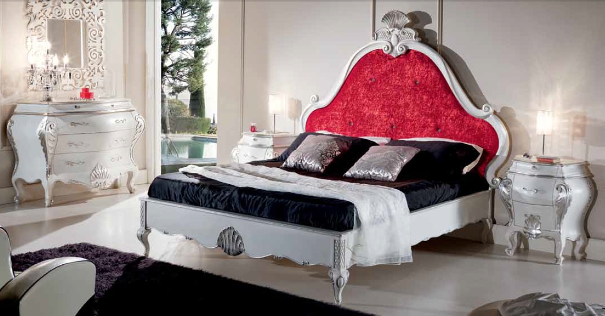 | Description: | Double bed with upholstered headboard, decorated with Svarowski crystals. The frame is made from solid, finish as in the photo, silver foil, carved elements are made manually. Upholstery textile. Grille not included. |