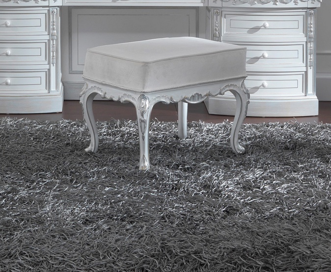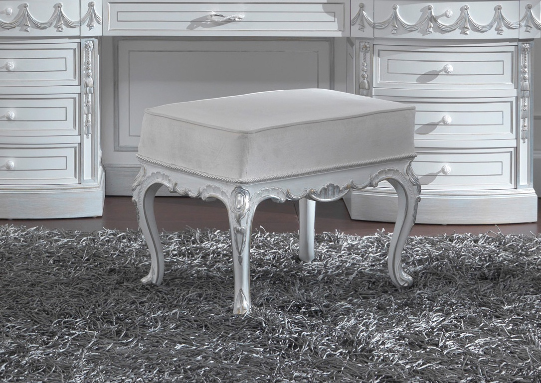 Poof Idalia-110 from the Italian manufacturer Fratelli Allievi. Upholstered rectangular Ottoman in Venetian style, made in carved wooden frame. Cushion upholstered in fabrics and trimmed with Welt. Material - solid wood, painted white, finished with carving and silver. Textile upholstery and trim in stock.