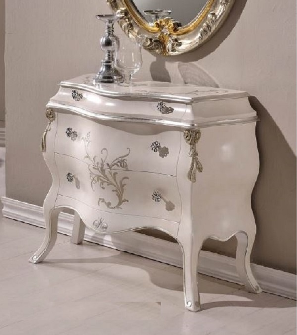 The Las Vegas chest of drawers from Italian manufacturer Vaccari International. Model made of solid wood, carved legs, a convex shape, with 3 drawers. Finish silver foil and lacquer, carved elements are made manually. Handles are metal. As in the photo.
