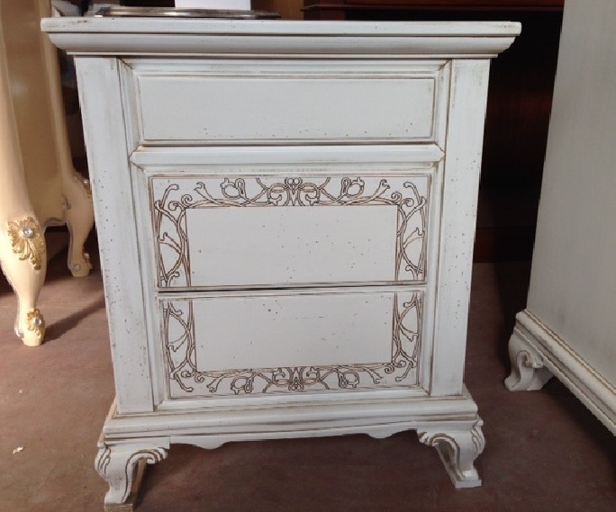 | Description: | Bedside table with 3 drawers on figured legs. Made of solid wood, finishing lacquer (as pictured) with the aging effect, the carved elements are made manually. Accessories to choose from. |