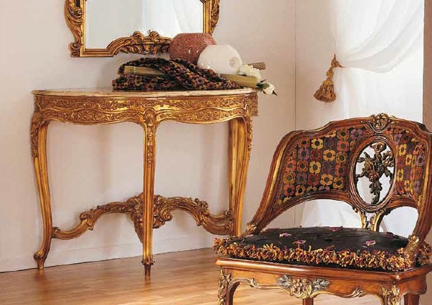 Console Aureola-1200/405 from the Italian manufacturer Fratelli Allievi. Model, made in the Rococo style, can also be used as a dressing table. Material - natural wood. Carved frame and curved legs are finished in a high volume gilding. The top semicircular shape. Colours in stock.