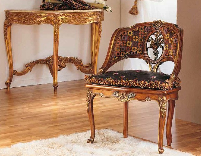| Description: | Chair Aureola-5318/C/101 from the Italian manufacturer Fratelli Allievi. Elegant semi-circular seat, in the Rococo style, decorate the interior of living room, bedroom or boudoir. The frame and legs made of natural wood decorated with carved and gilded surround. Semi-circular back, upholstered fabrics, decorated with openwork carving. Complements the seat cushion, with tassels and applique. Multicolor textile upholstery, in dark colours; trim at the photo. |