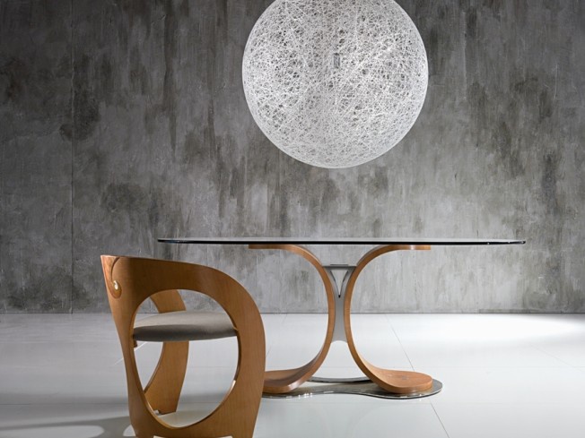| Description: | Dining table. The simplicity of the lines emphasizes the natural elegance of the model. The structure is completely made of curved wooden planks of the array, connected by a Central element and a metal chrome base. Glass top is recognizable thanks to its original form. Stylized d?cor inlays, made of noble woods, such as cherry, Zebrano, ebony, the root of the tree. Options of finishes: maple, F00, F12 or oak lacquered white. |