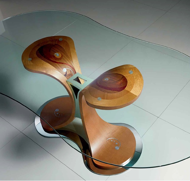 The MISTRAL dining table from the Italian manufacturer Carpanelli. The simplicity of the lines emphasizes the natural elegance of the model. The structure is completely made of curved wooden planks of the array, connected by a Central element and a metal chrome base. Glass top is recognizable thanks to its original form. The decoration F00 with stylized decoration of inlays, made of noble woods, such as cherry, Zebrano, ebony, the root of the tree.