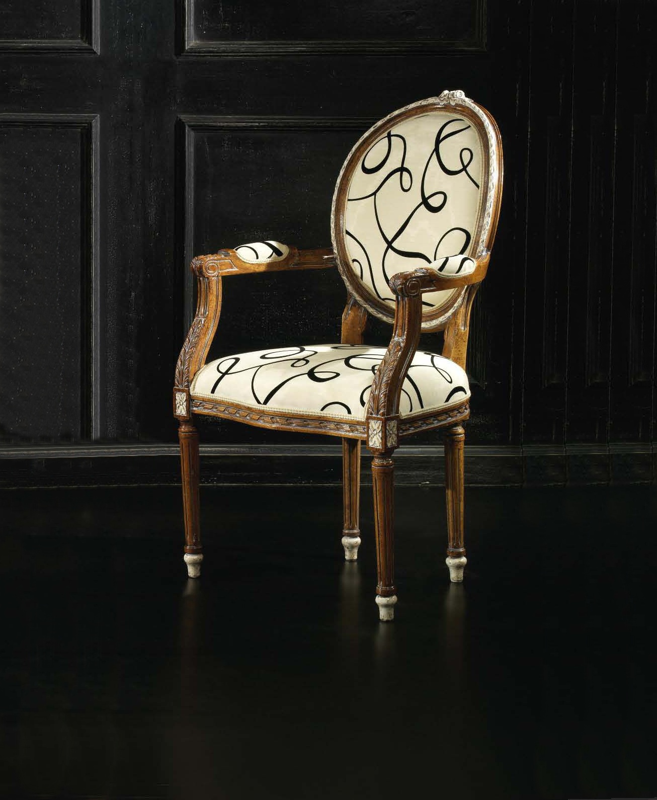 Armchair from Italian manufacturer Vittorio Grifoni. The model is made of wood, upholstery - textiles. The chair has padded armrests and a decorative pattern. Elegant model will transform Your interior.