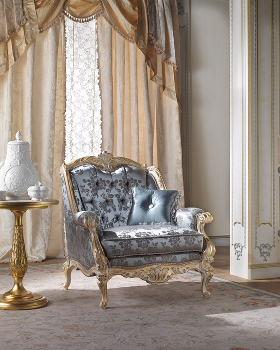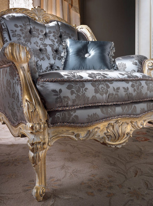 The Cardinale armchair-101 from the Italian manufacturer Fratelli Allievi. Wide Bergere armchair with low-slung in the Rococo style will become a favorite place for relaxing during the day. Frame and turned legs Cabriole made of wood and decorated with carving and gilding. Curly back, decorated with carved phial and trimmed inside with stitch Capito, upholstered rolled armrests. Upholstery satin, a color catalogue of the manufacturer.