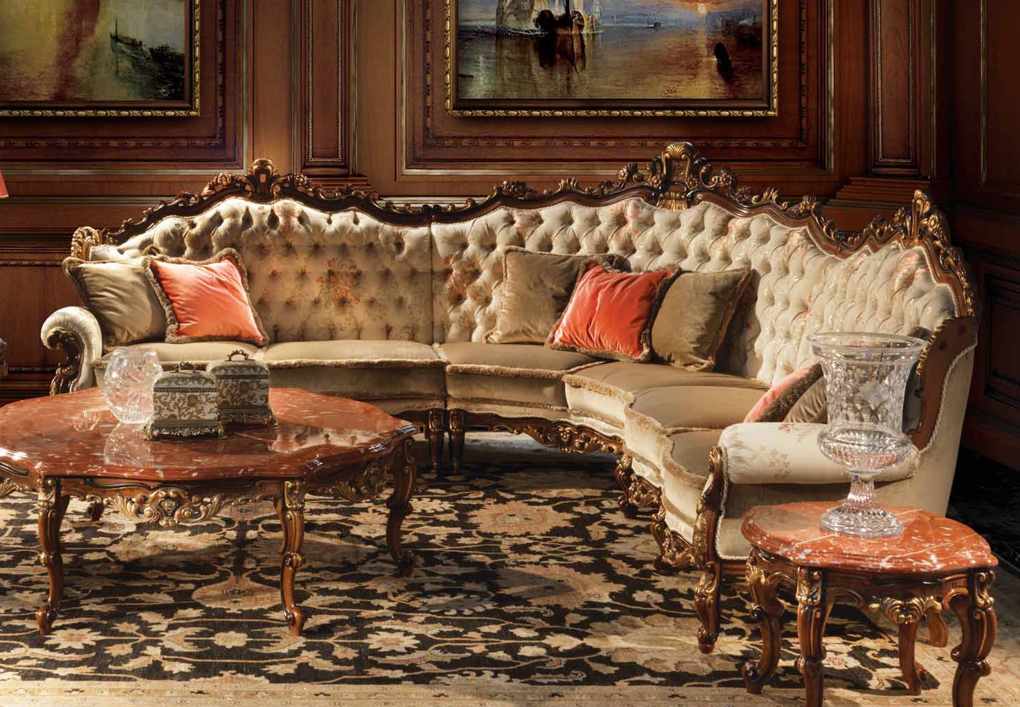 Corner sofa from Italian manufacturer Ezio Bellotti. The frame is made of wood, decorated with carving. Upholstery - textiles from the company portfolio. Colours in stock.