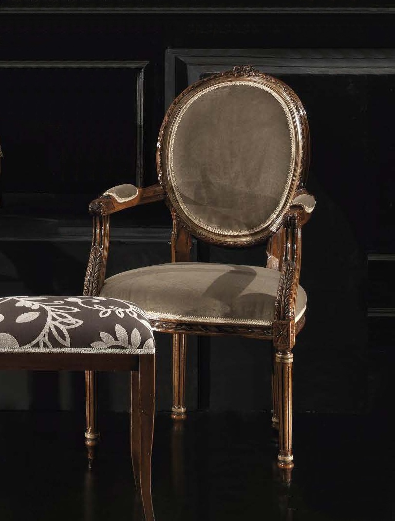 A chair from the Italian manufacturer Vittorio Grifoni. The model is made of wood, upholstery - textiles. Oval upholstered back and decorative trim give the chair a refined and elegant look. The chair from Vittorio Grifoni will not only beautify Your interior but will also create a cozy and comfortable atmosphere.