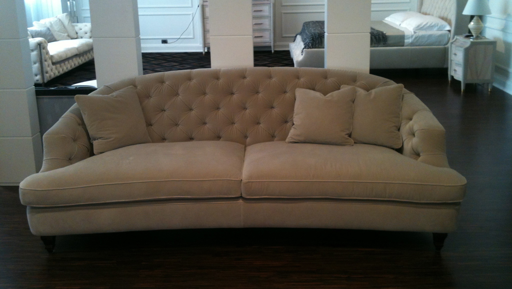Double the Savon sofa from Italian manufacturer Tosconova. Model with a rounded back. The frame and legs wooden. Finish the catalog of the company. Seat and back covered with textiles. The ornament serves as a decorative stitch-Capito and pillows.