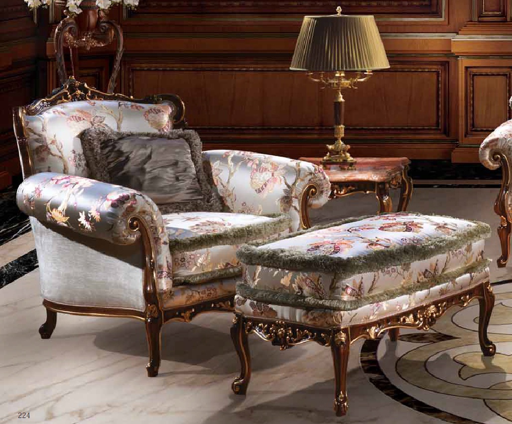 Easy chair from the Italian manufacturer Ezio Bellotti. The frame is made from a natural tree, decorated with handmade carving. Upholstery - textiles from the collection of the company.