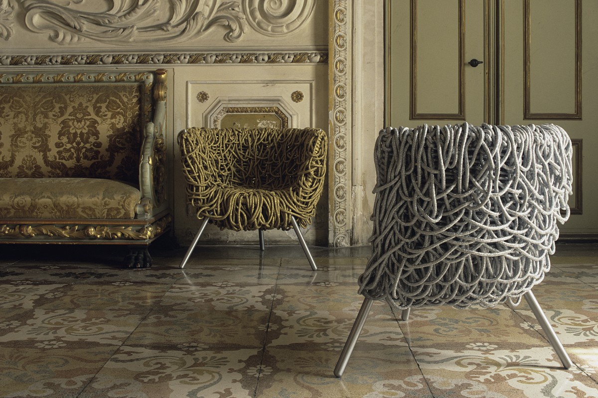 The Vermelha chair from the Italian manufacturer Edra. The model designer. Made of braided ropes. Is the manual work skilled in weaving special rope. The steel frame penopoliuretanovyj filler. For upholstery, use textile. Colours in stock.