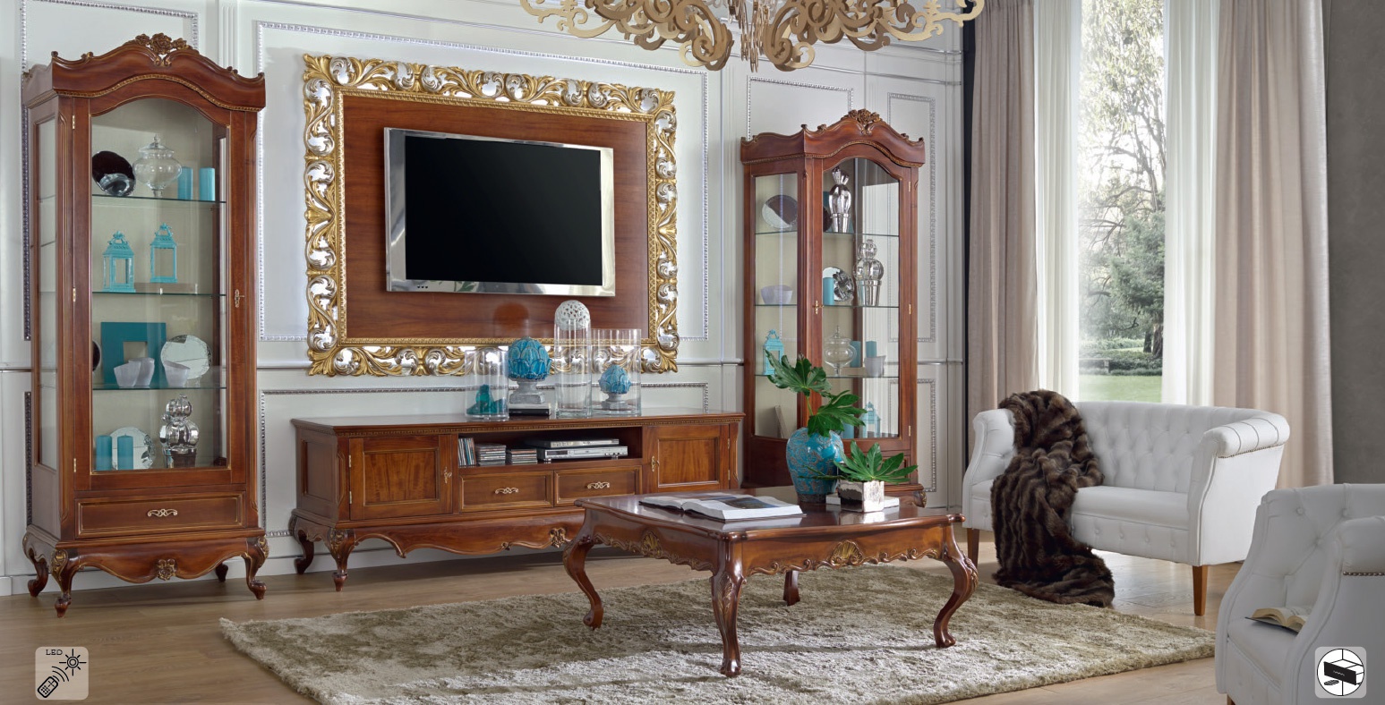 Showcase from Italian manufacturer Mirandola Export. The frame is made of wood and decorated with carvings. Finish as in the photo - M73. Side panels and glazed door, shelves made of glass. The design is executed in classical style.