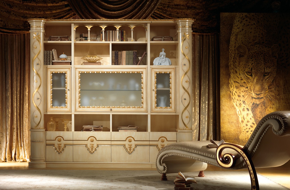 Zebrano wall from the Italian manufacturer Carpanelli. Wall for books and dishes. Carried on the frame of layered wood. Provided hinged wood and glass door, flanked by rounded columns retractable. Finish with lacquer, inlay, gilding, silver.
