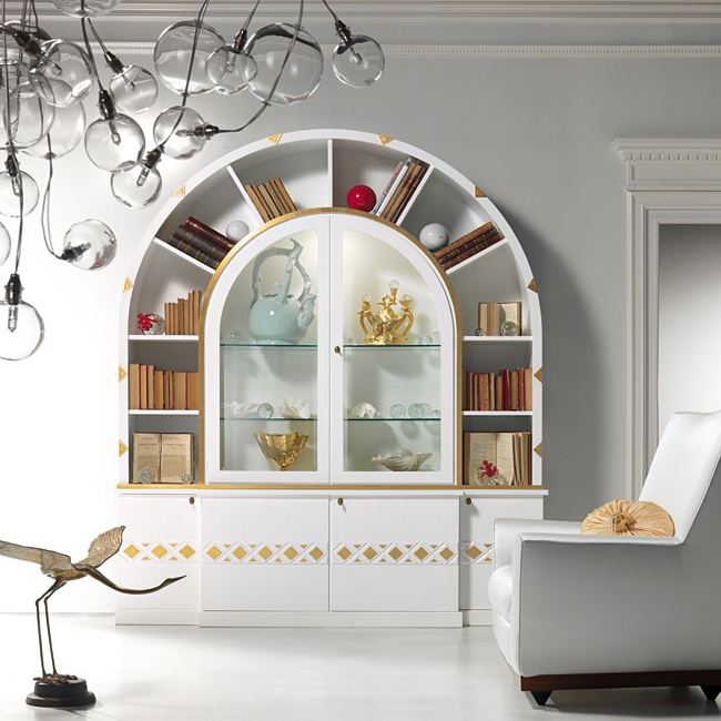 ARCO showcase DUE from the Italian manufacturer Carpanelli. Structure made of multilayer wood. The lower part with hinged doors in white lacquer finish with inserts in the form of rhombs of gold foil. In the upper part of a glass door in the form of an arch and open shelves for books, decorated with triangles and a border of gold foil.