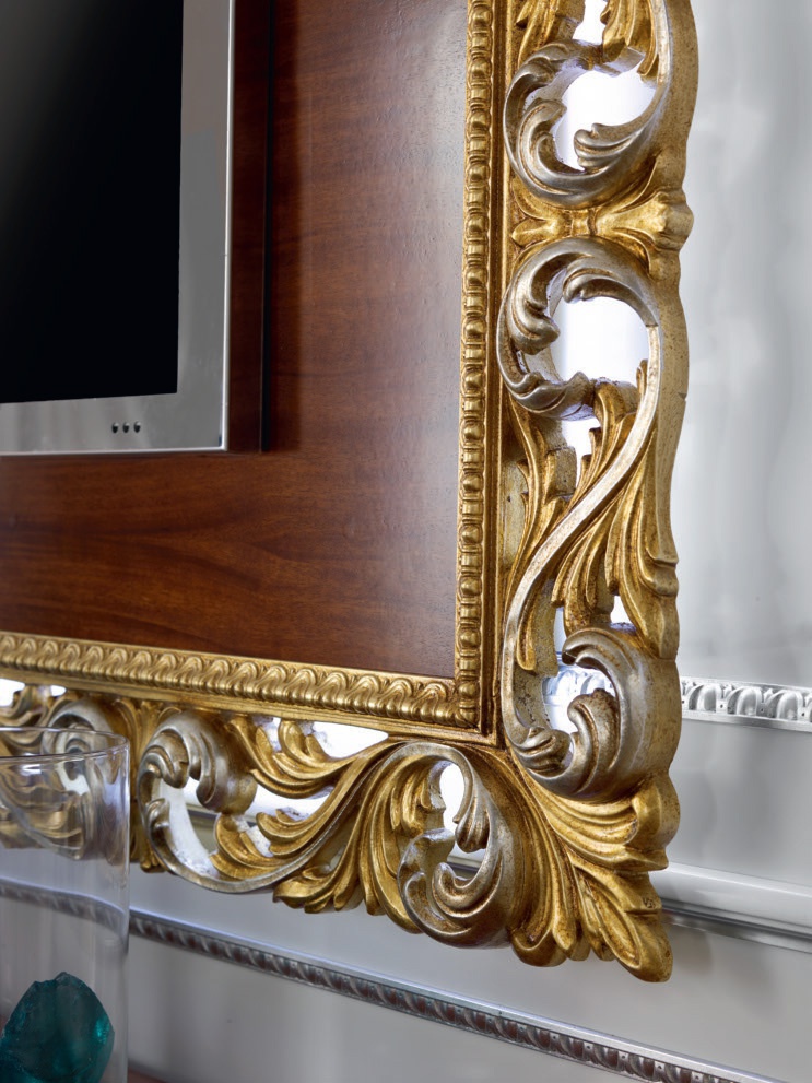 Furniture for TV from the Italian manufacturer Mirandola Export. Presents a frame of wood decorated with carvings and gilding. Finish - M73. Frame dimensions: W. 193 D. 7 H. 144 cm (ext. size); W. 157,5 cm H. 108 (int. size). Design in the classic style.
