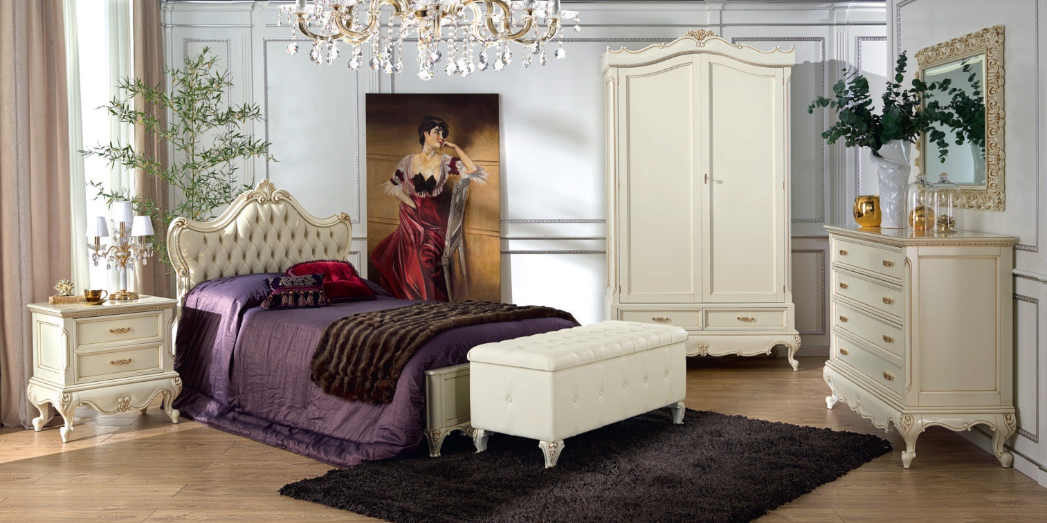Bedroom (Suite bedroom) from the Italian manufacturer Mirandola Export. Set includes: double bed, chest of drawers, bedside table, wardrobe and bench. Complements set wall mirror in a frame. The furniture is made of wood and decorated with carvings. A style classic. Color headset - white.