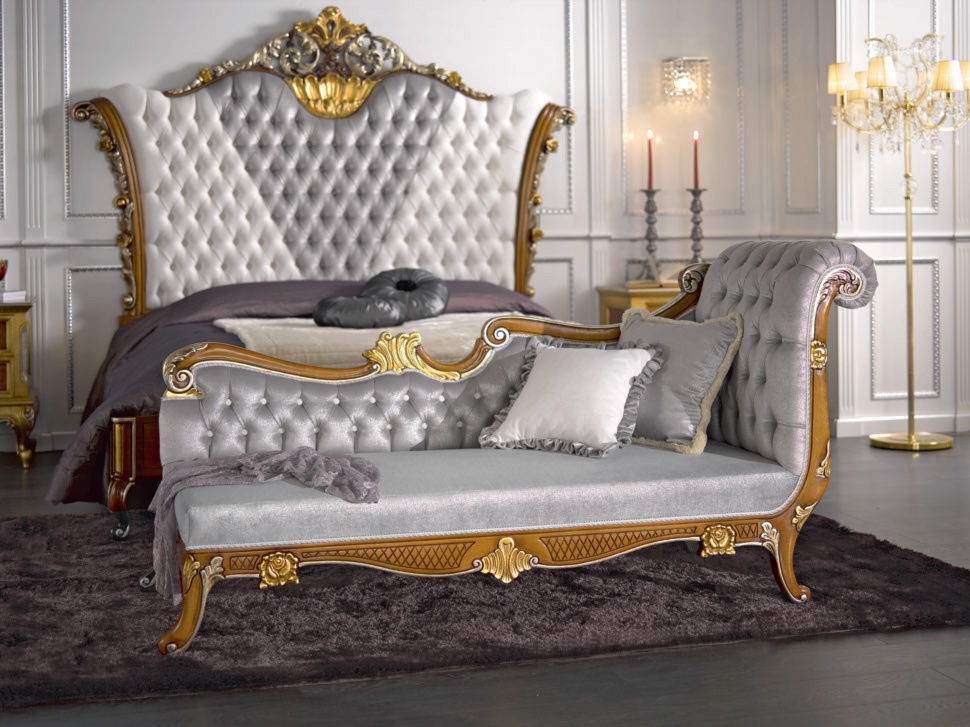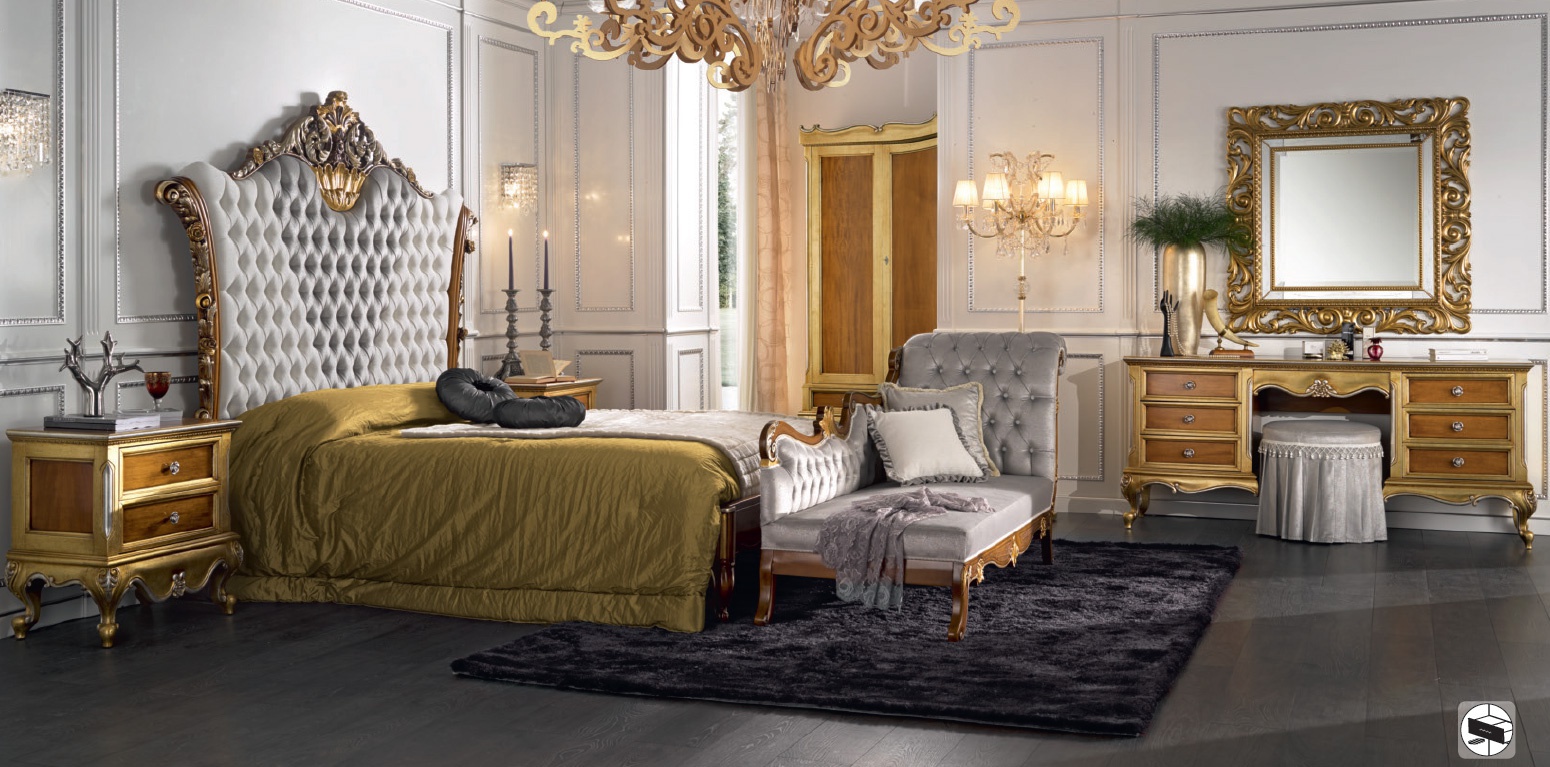 Bedroom (Suite bedroom) from the Italian manufacturer Mirandola Export. Set includes: double bed, bedside tables, dressing table, couch and Ottomans. The furniture is made of wood. Decoration is carved and gilded elements. The upholstery is made of textile cloth. A style classic.