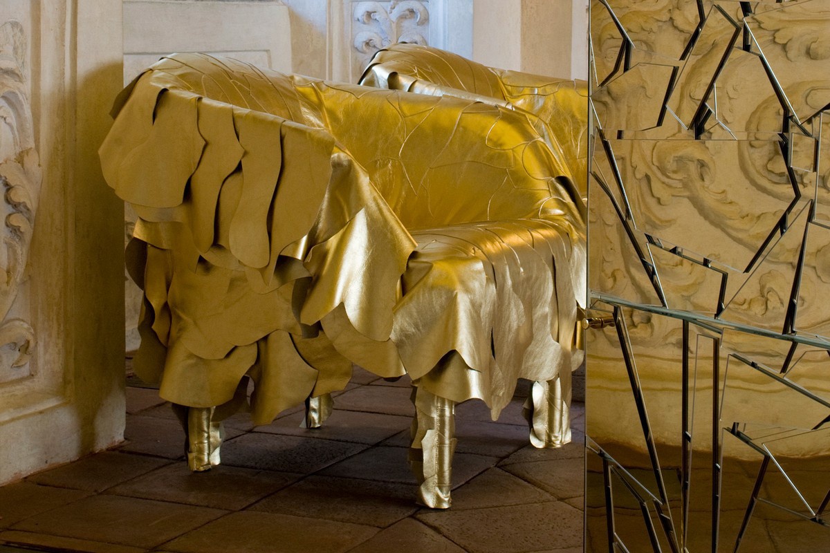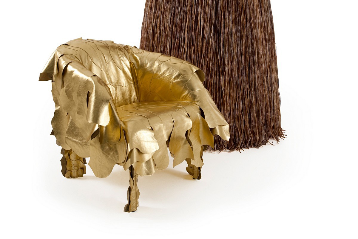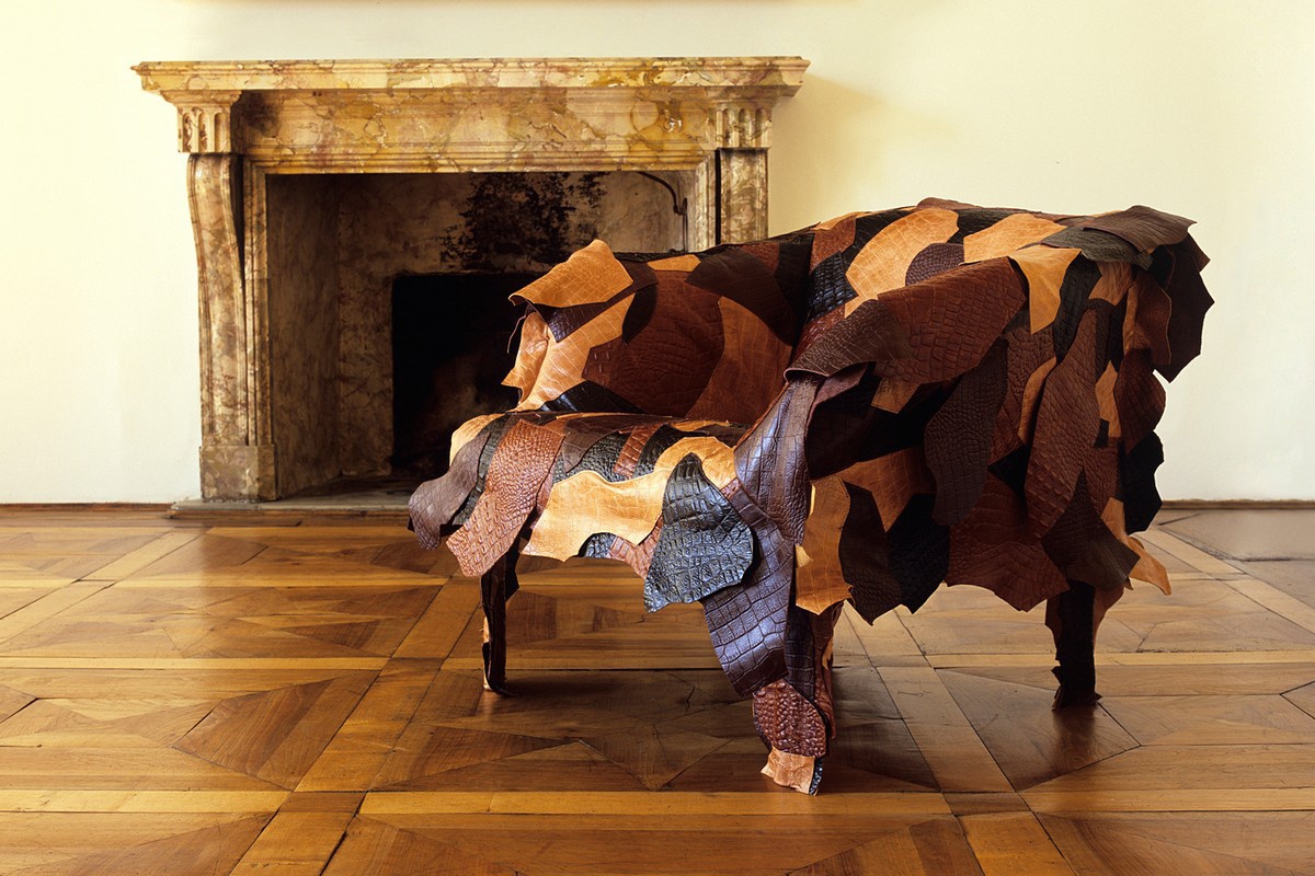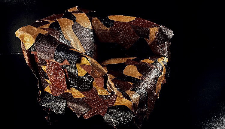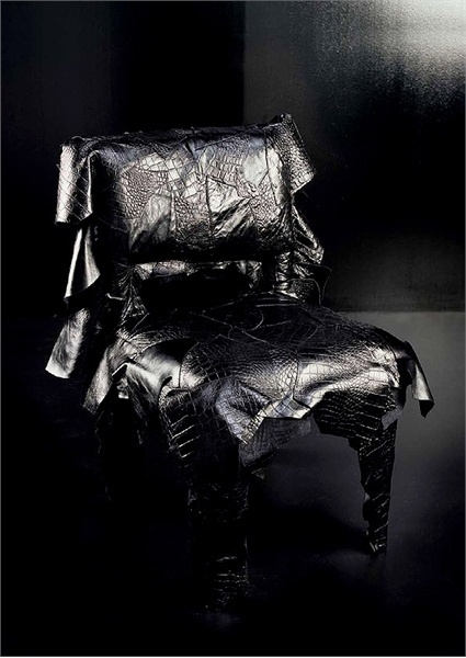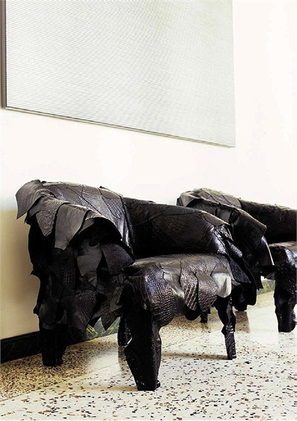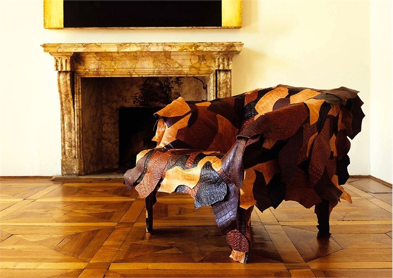 Seat upholstered in leather scraps from Leather Works, Edra
