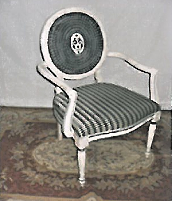 Armchair from Italian manufacturer Vittorio Grifoni. The model is made of wood, upholstery - textiles. The chair has an oval back decorated with carvings. Padded seat and comfortable armrests give the chair greater comfort. The chair will perfectly complement Your interior.